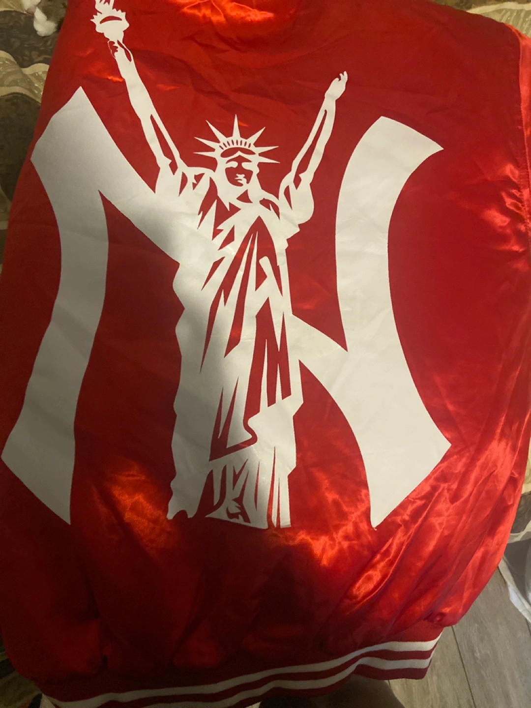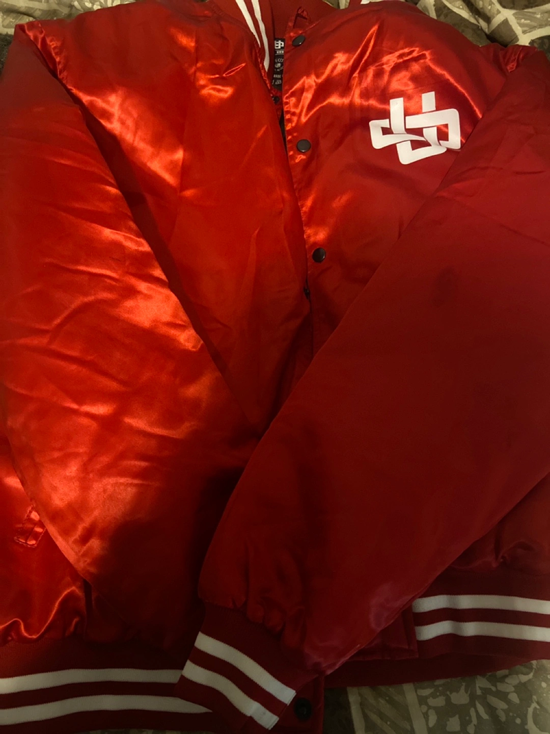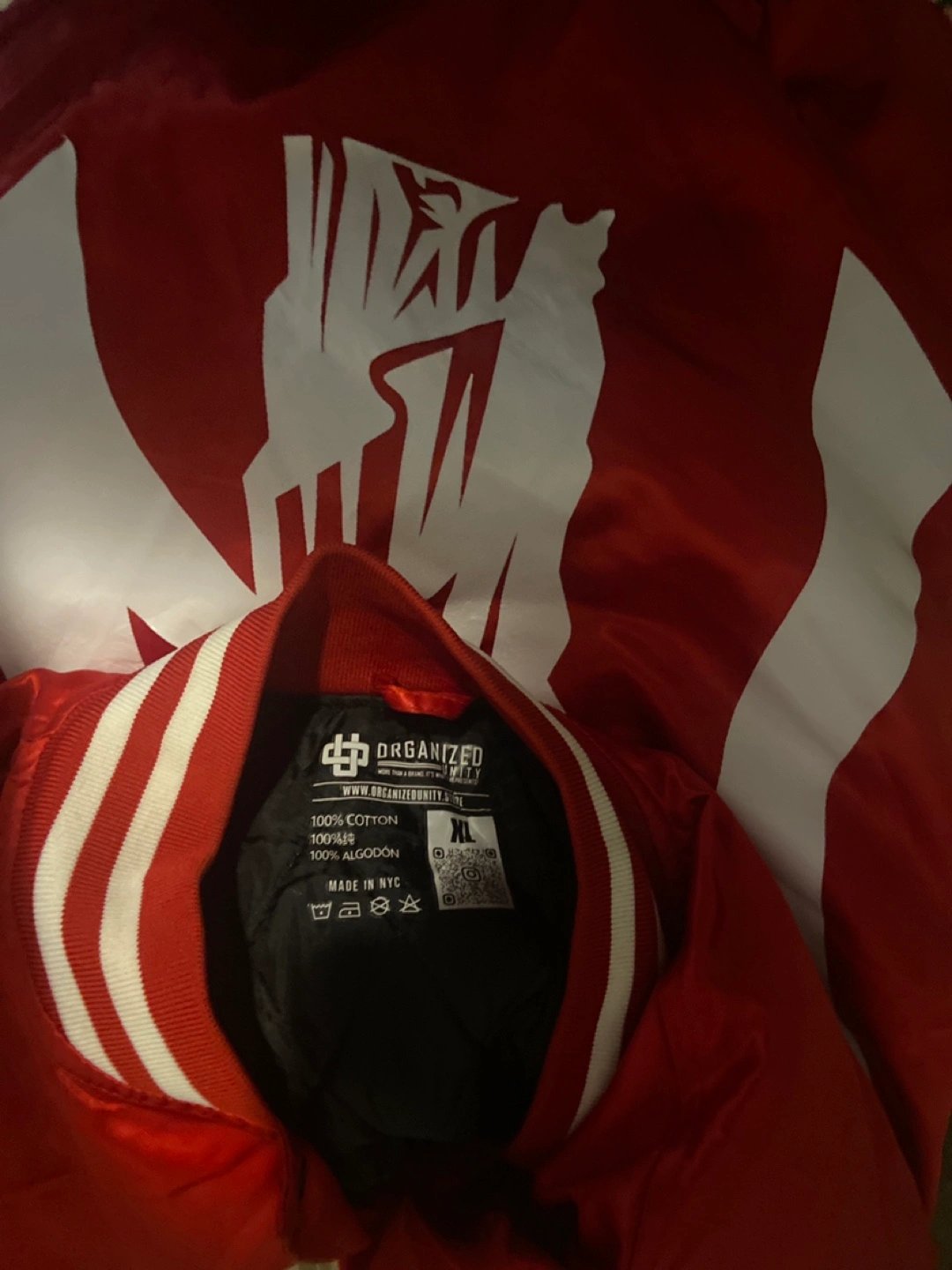 Selling a red bomber jacket from Organized Crime NY in size XL! It's made of 100% cotton and has a cool design on the back. Perfect for adding a pop of color to your wardrobe + ๐ฅ
