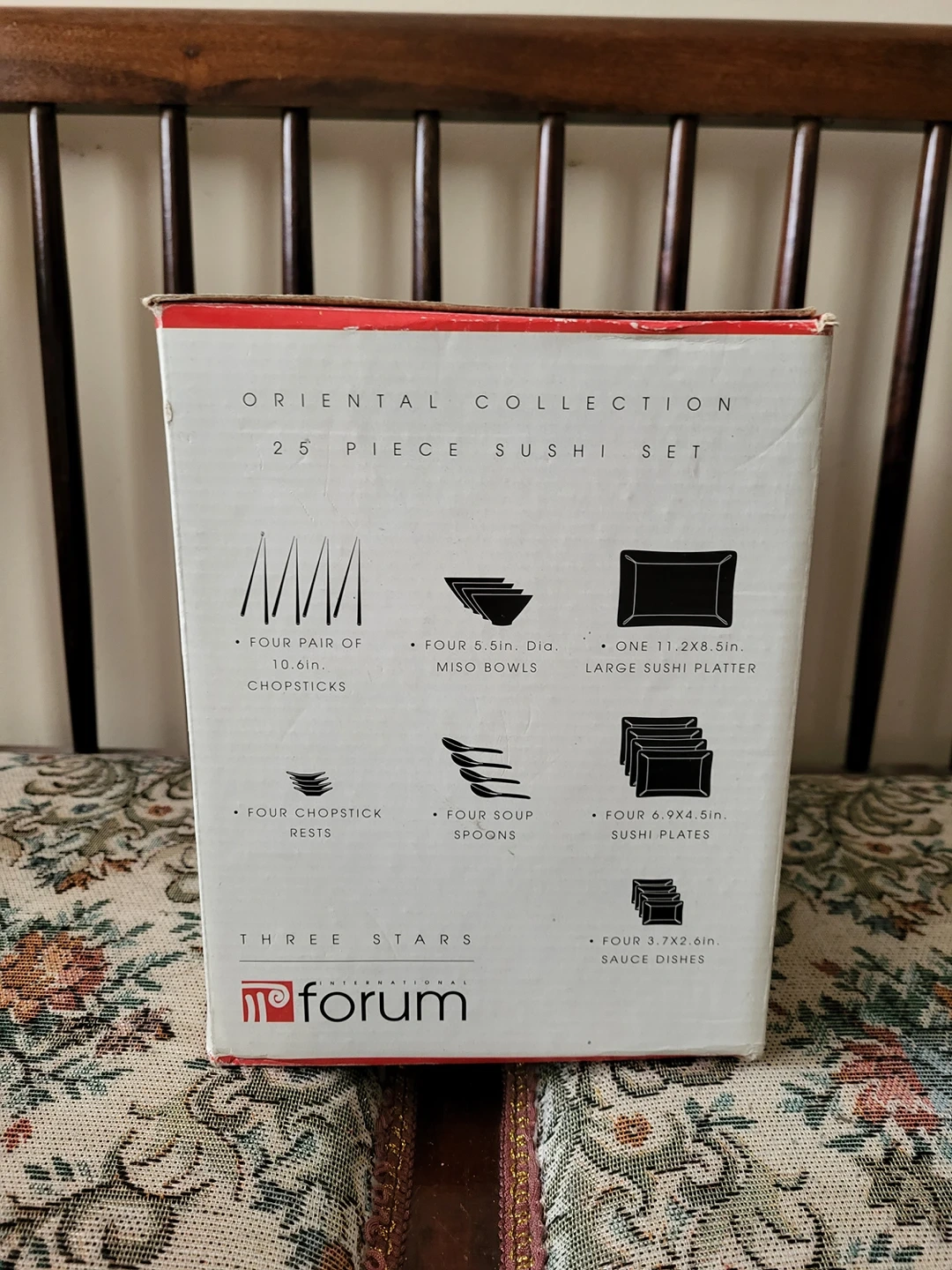177ORIENTAL COLLECTION SUSHI SET OF: 4 PAIRS OF 10.6" CHOPSTICKS; 4 CHOPSTICK RESTS; 4 MISO BOWLS 5.5" DIAMETER; 4 SOUP SPOONS; 1 LG SUSHI PLATTER 11.2" X 8.5"; 4 SUSHI PLATES 6.9" X 4.5"; 4 SAUCE DISHES 3.7" X 2.6".