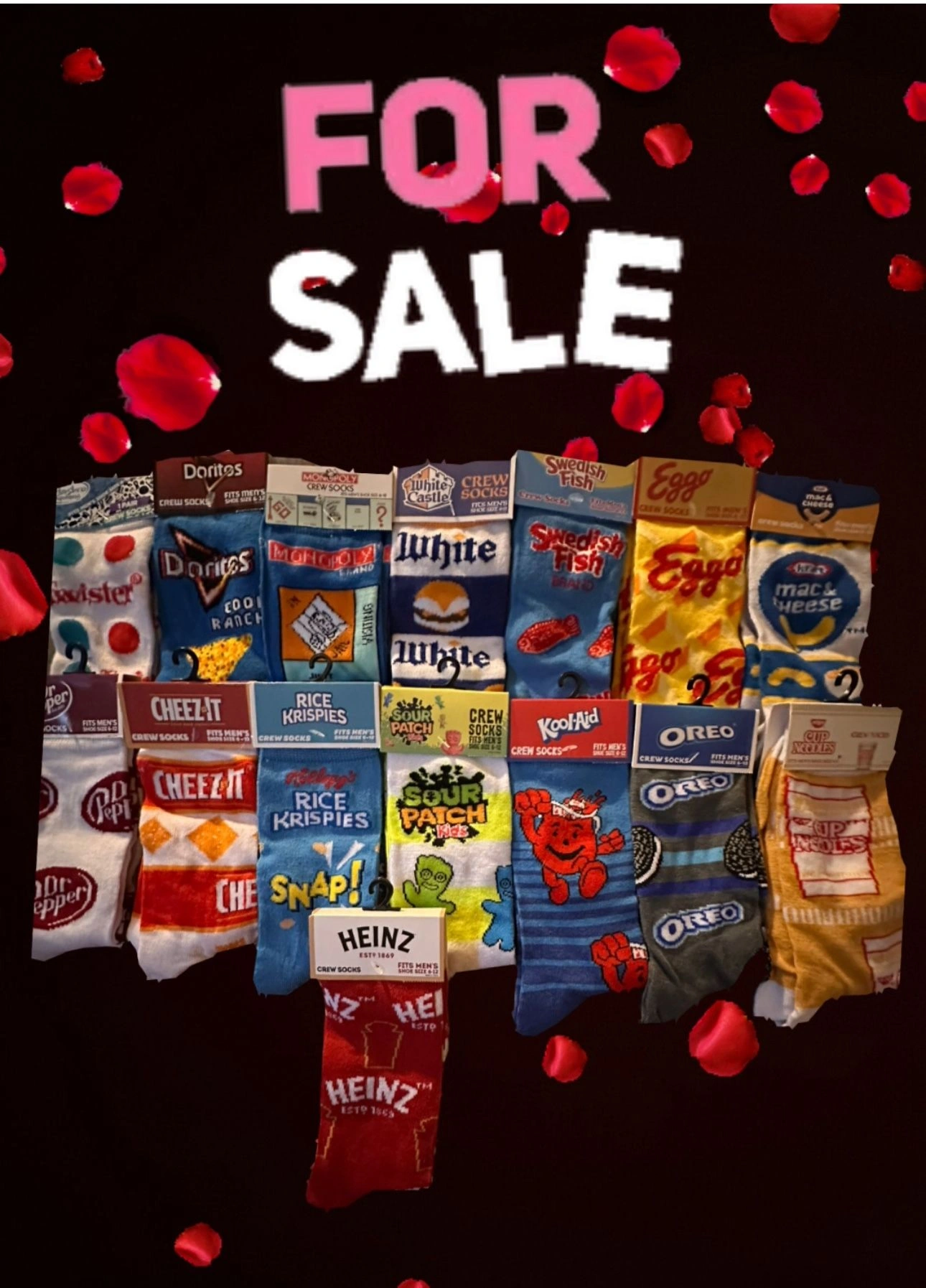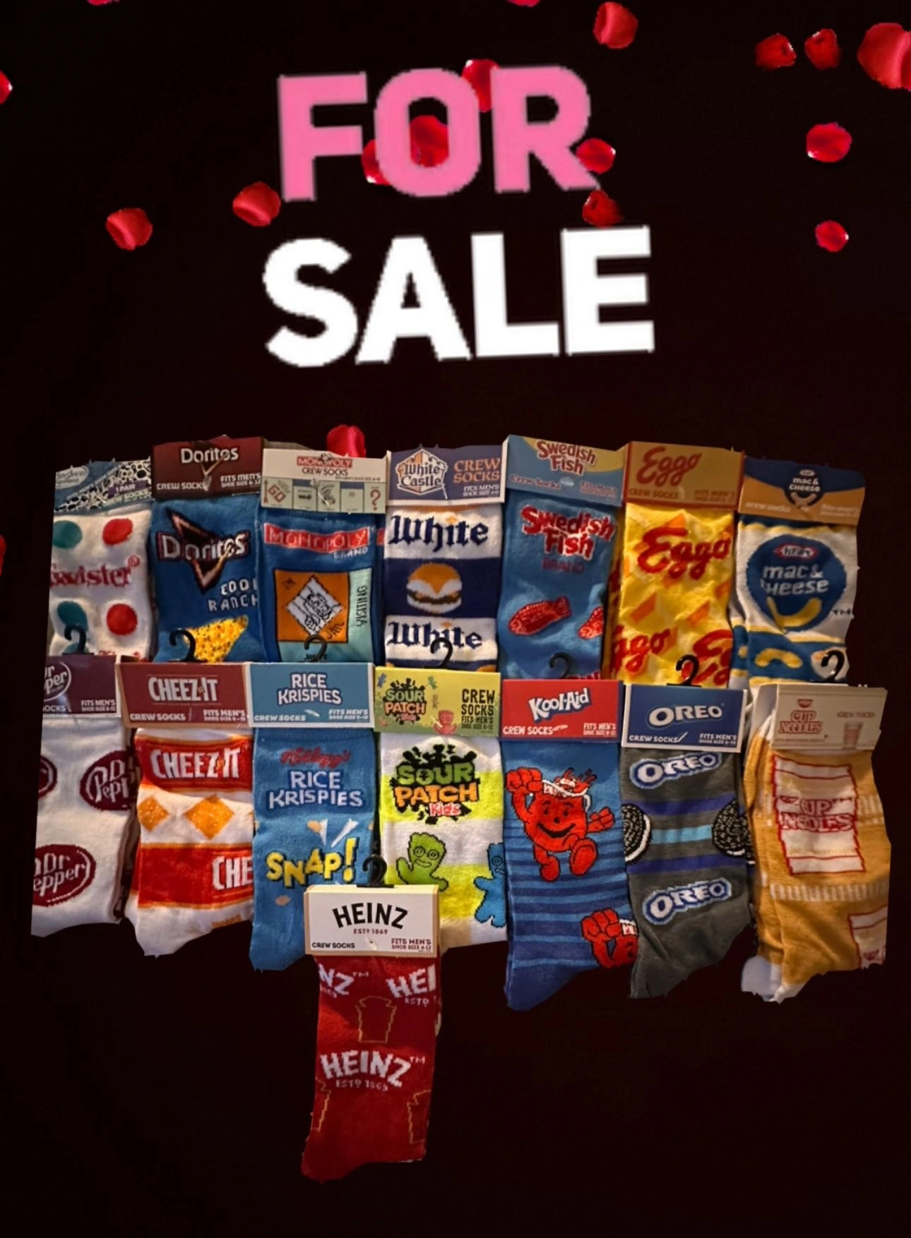 Crew socks, men's and unisex, assorted sealed packs. You pick the style! Each pair is sold separately unless you buy in bulk. Available styles include Pringles, Old Bay, Moon Pie, Twinkies, Teddy Grahams, Pez, Cup Noodles, Frank's Red Hot, Chips Ahoy, Eggo, Swedish Fish, Oscar Mayer, Pop Tarts, Kellogg's Frosted Flakes, Sour Patch Kids, Hawaiian Punch, Skippy Peanut Butter, Bagel Bites, and Sunny D. All are new in sealed packages. Feel free to ask any questions!