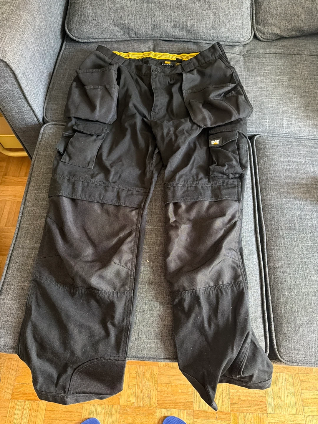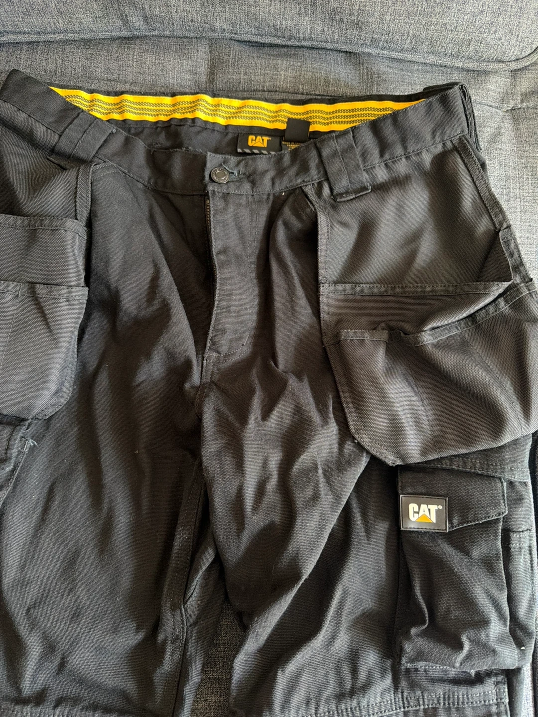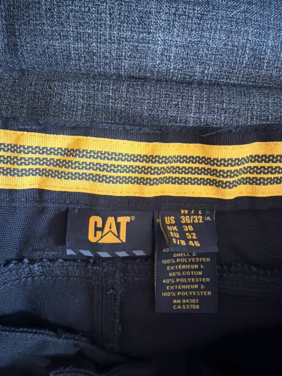 Durable CAT work pants in black. Shell is 100% polyester with 60% cotton and 40% polyester exterior. Plenty of pockets for tools and gear. These are built tough for a hard day's work!