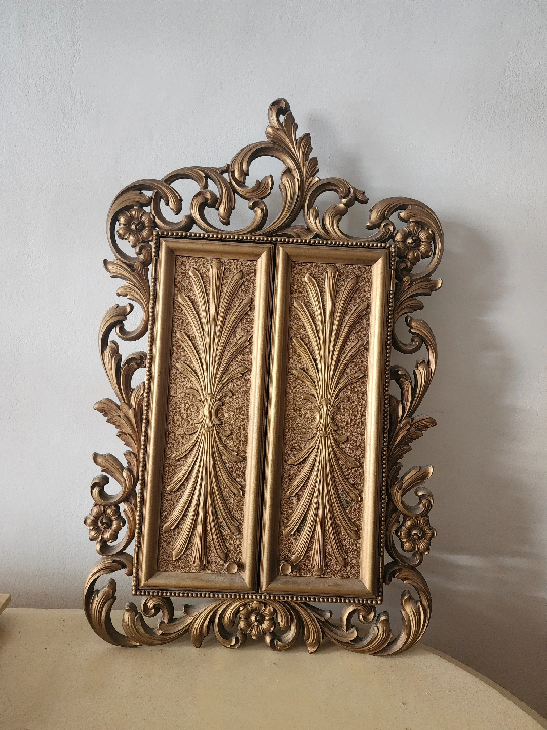 This is a beautiful, ornate jewelry box with a mirror. It features a gold finish and a burgundy velvet interior. It has compartments for rings, necklaces, and other jewelry. A stunning piece for any vanity or dresser!