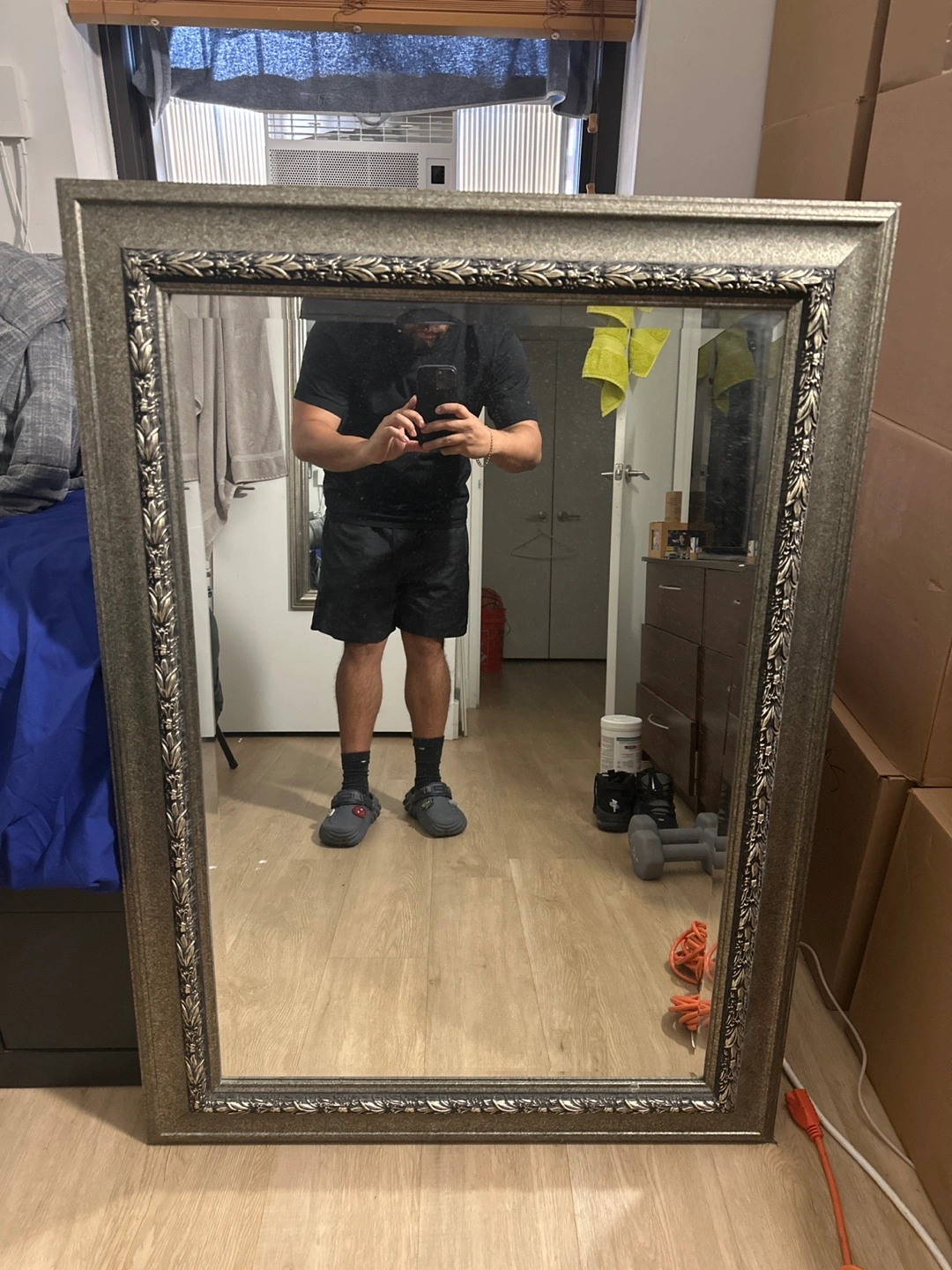 5Large, framed mirror with an ornate silver frame. The frame is slightly tarnished and has an intricate design.