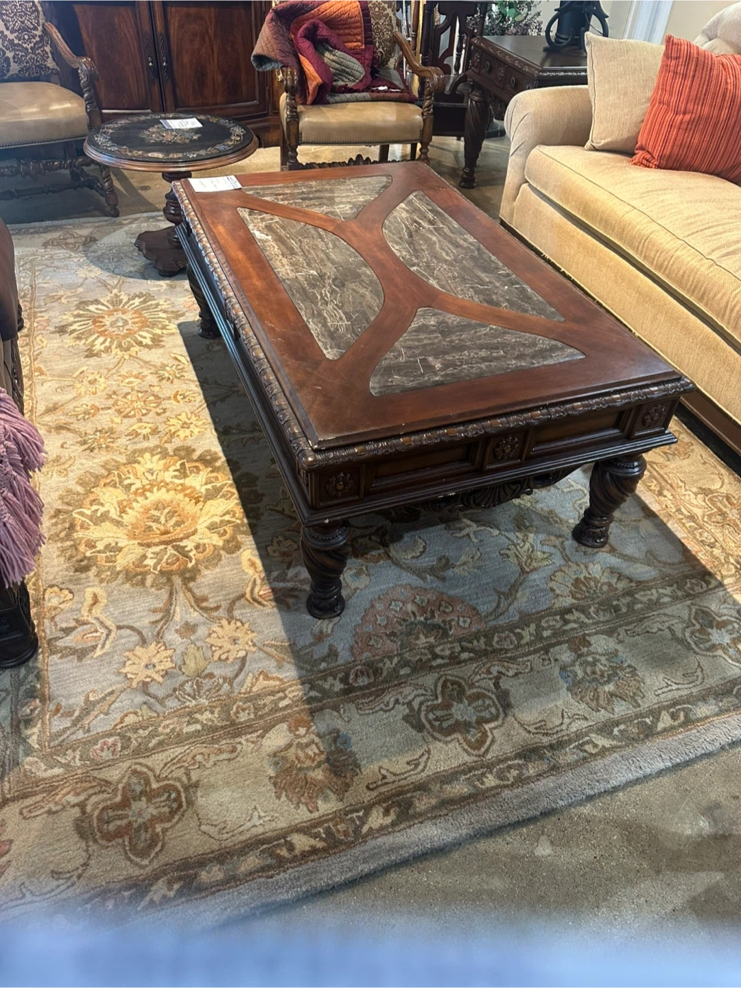 This is a beautiful, ornate coffee table with a wood frame and a marble top. It's a stunning piece that would look great in any living room! Dimensions: 34x 55x20