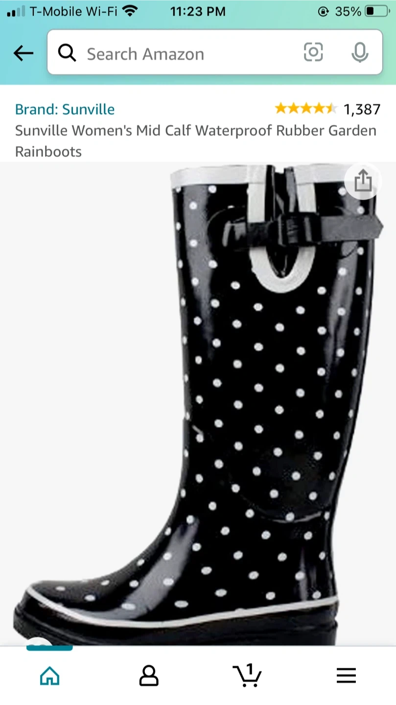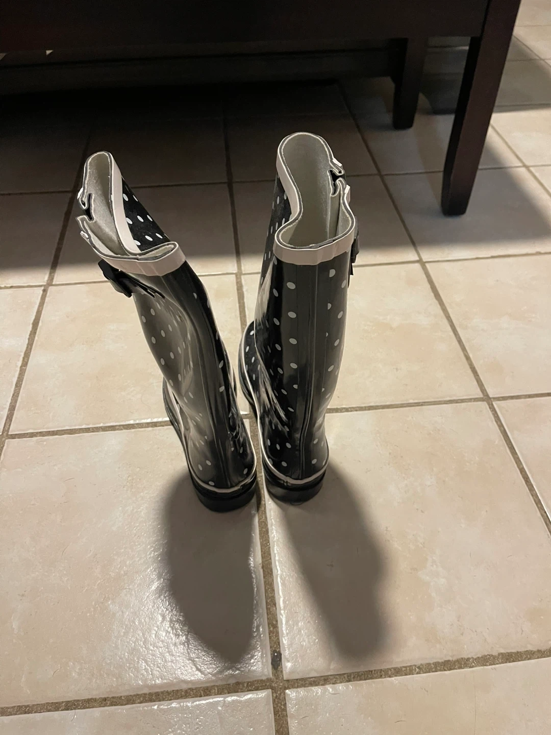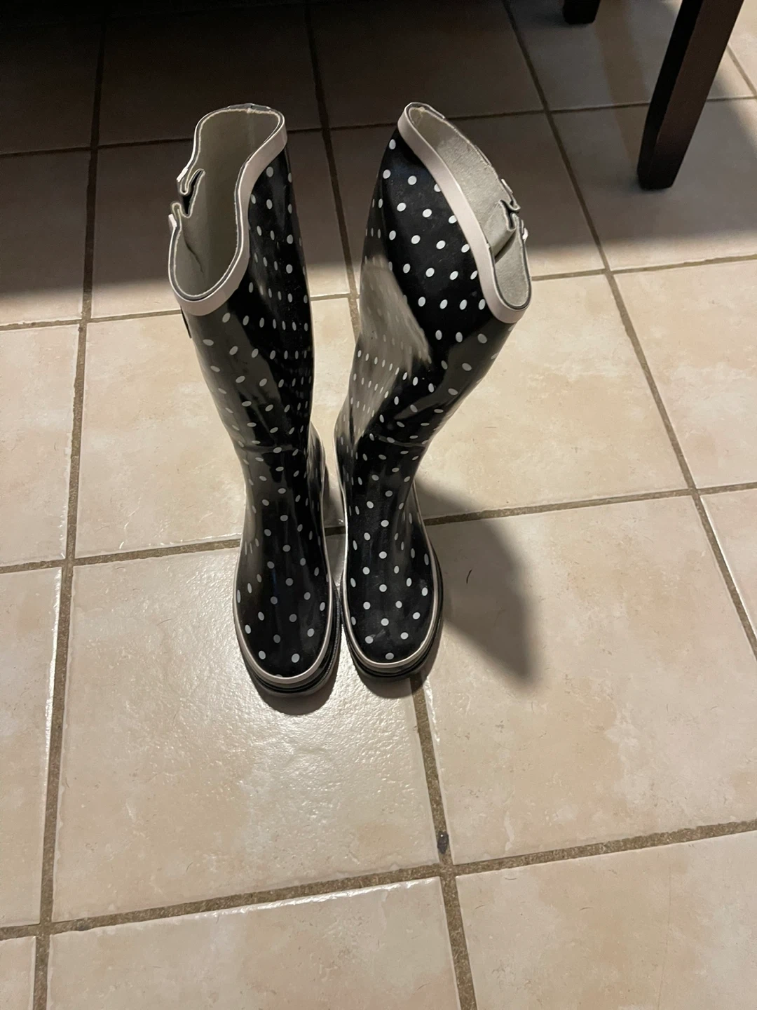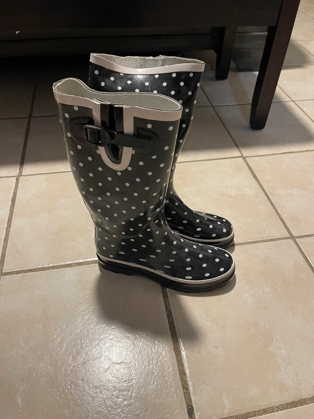 These are black rain boots with a white polka dot pattern. They have a white trim around the top and a buckle detail on the side. Made of rubber.