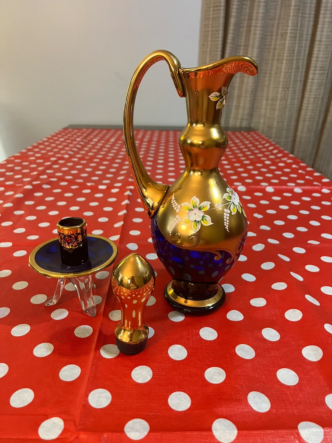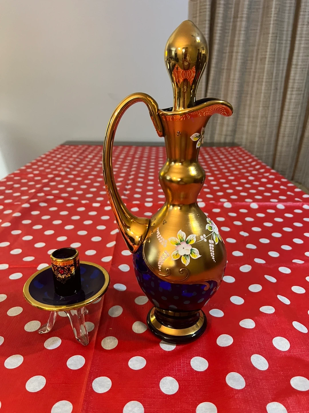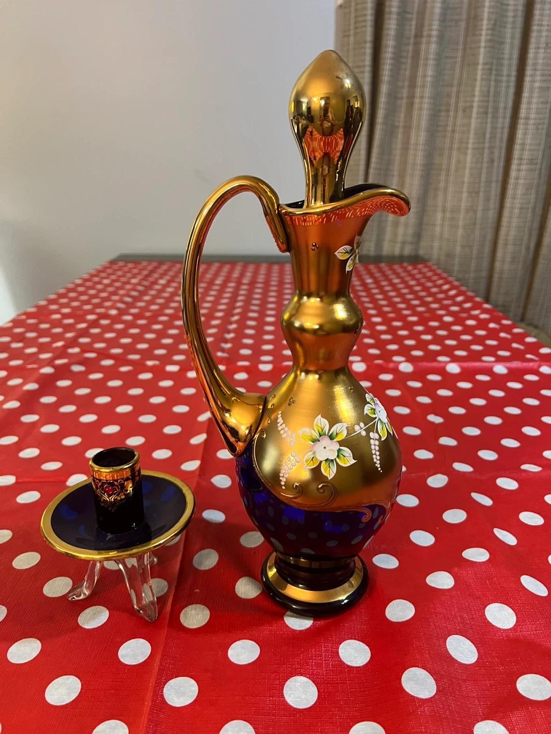 This is a decorative gold glass pitcher with blue accents and hand-painted flowers. It includes a small glass holder and stopper. It's a beautiful piece for display!