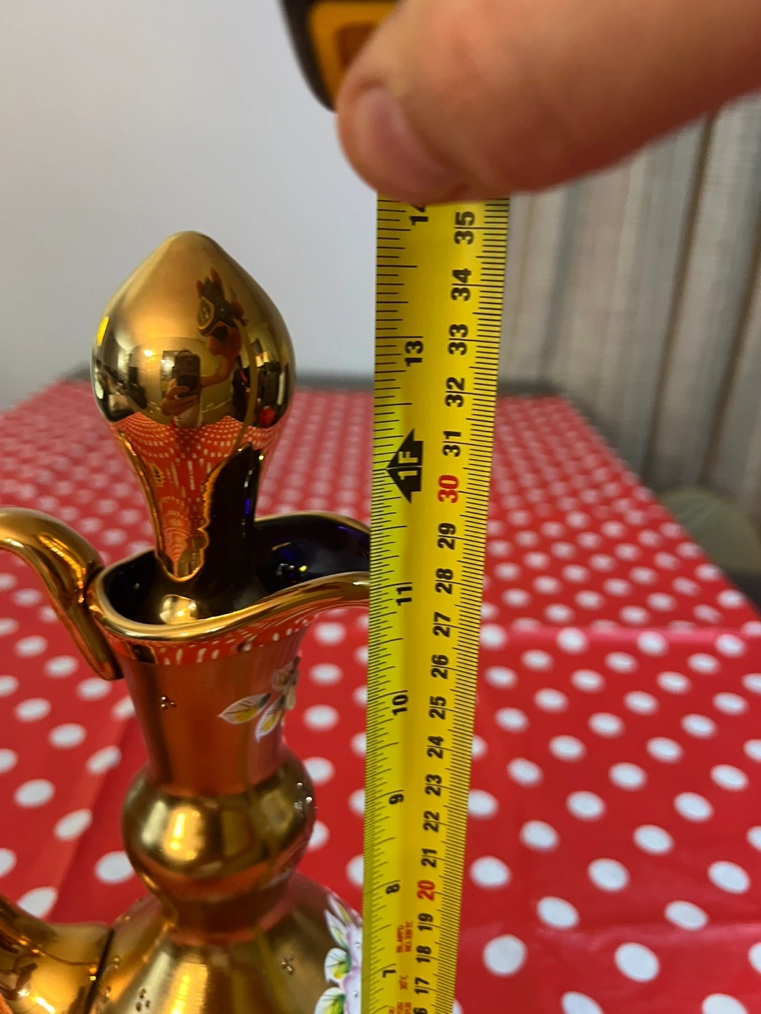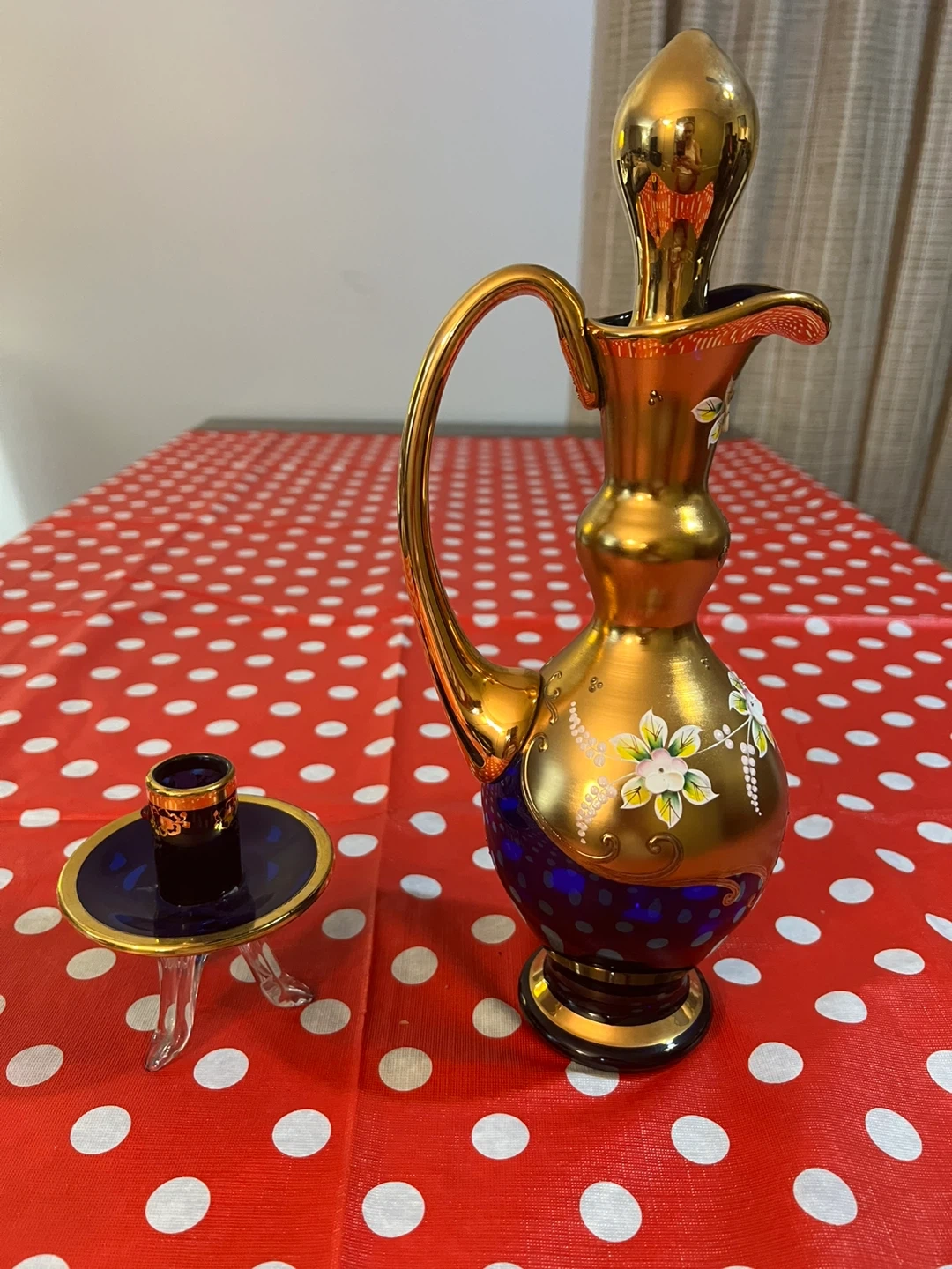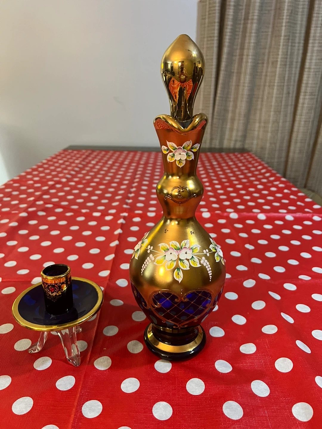 This is a decorative gold glass pitcher with blue accents and hand-painted flowers. It includes a small glass holder and stopper. It's a beautiful piece for display!