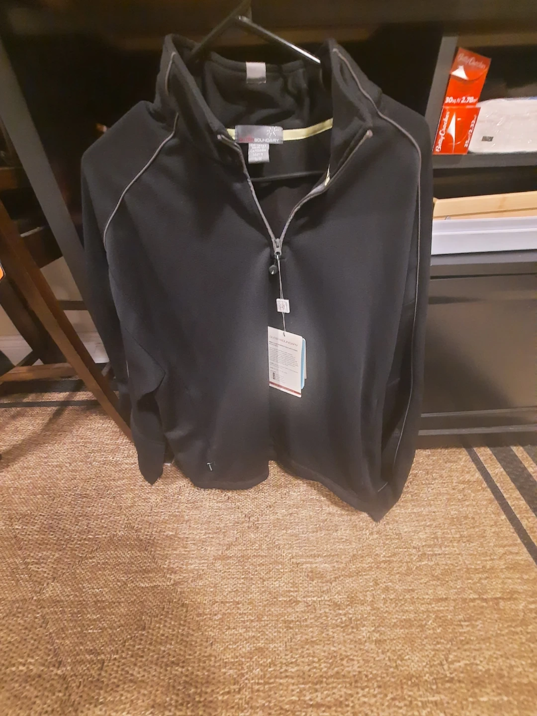 This black golf pullover jacket features . It has a quarter-zip closure and contrast piping along the seams. This piece is useful for staying comfortable on the golf course or for casual wear. SIZE. MEDIUM