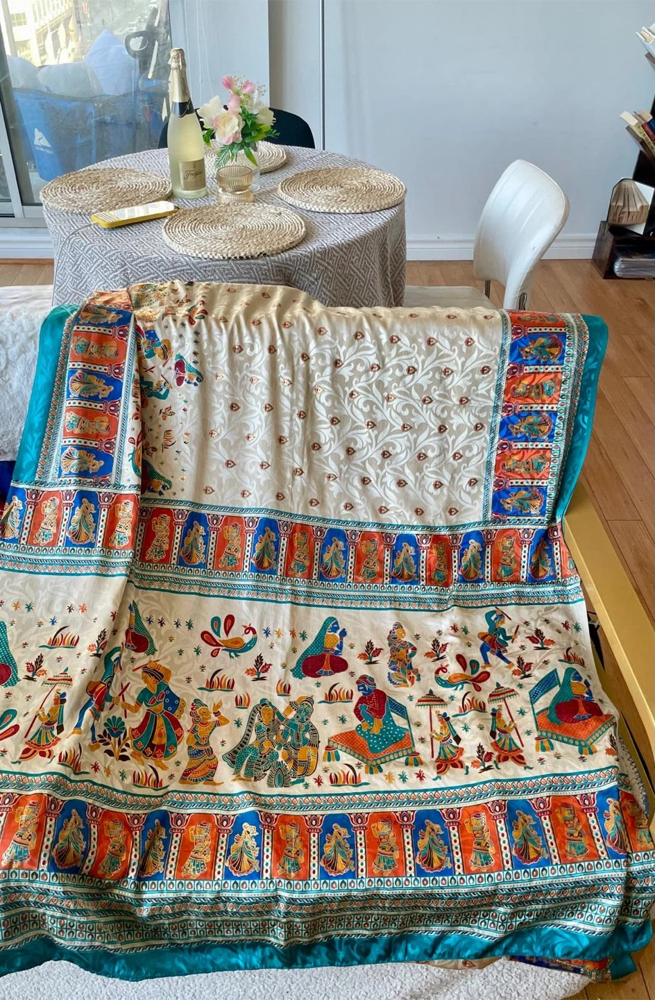 This is a beautiful Indian sari fabric featuring a cream background with detailed patterns and a vibrant, colourful border. The design depicts figures and motifs in shades of orange, blue, and red. It's made of a silk-like material with a subtle sheen. This fabric would make a stunning scarf or a decorative accent piece!