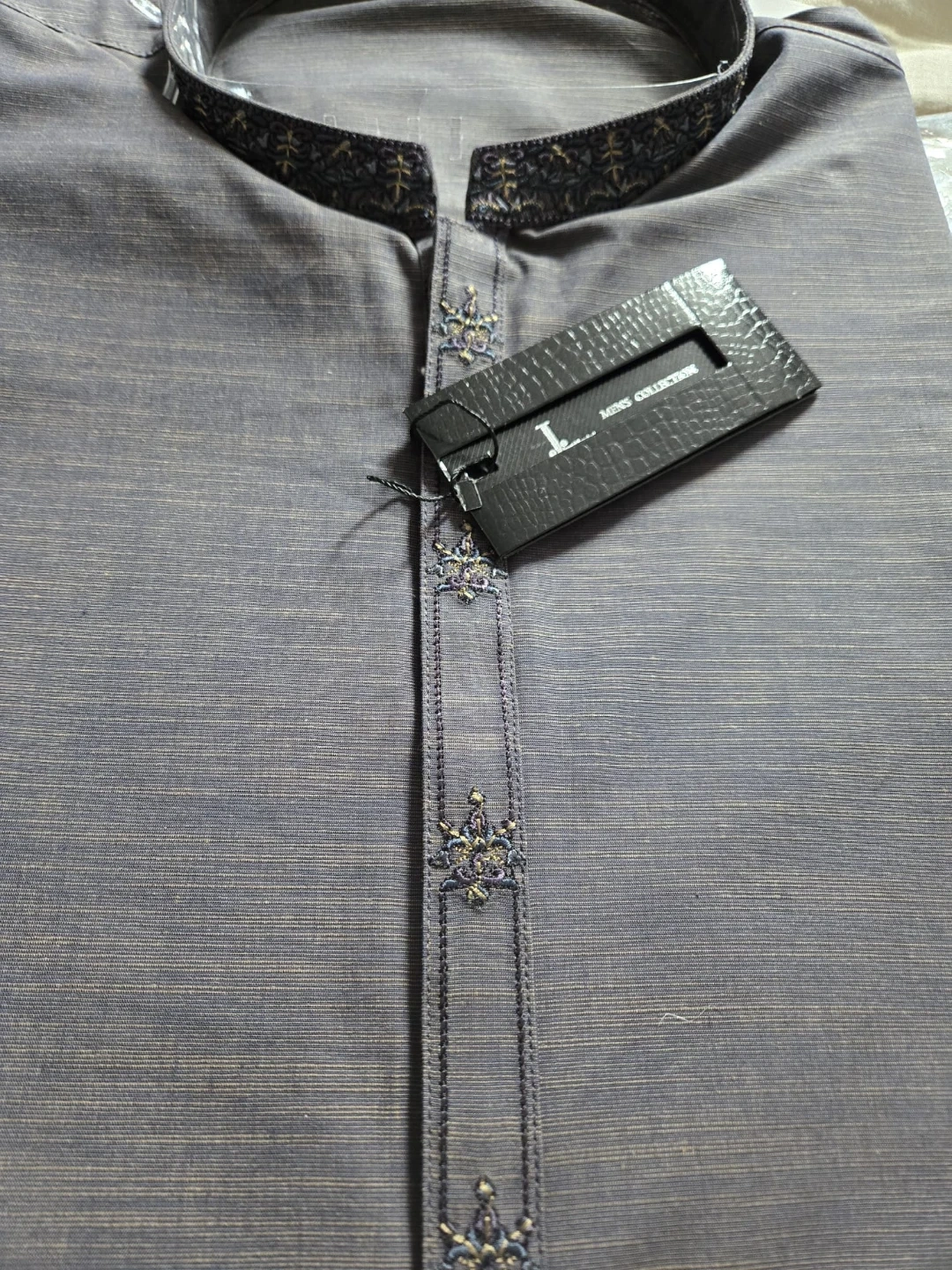 This J. MEN'S COLLECTION kurta and Trouser is a stylish choice. It's made from a soft grey fabric with intricate embroidery on the collar and placket. It's a great option for cultural events or casual wear.