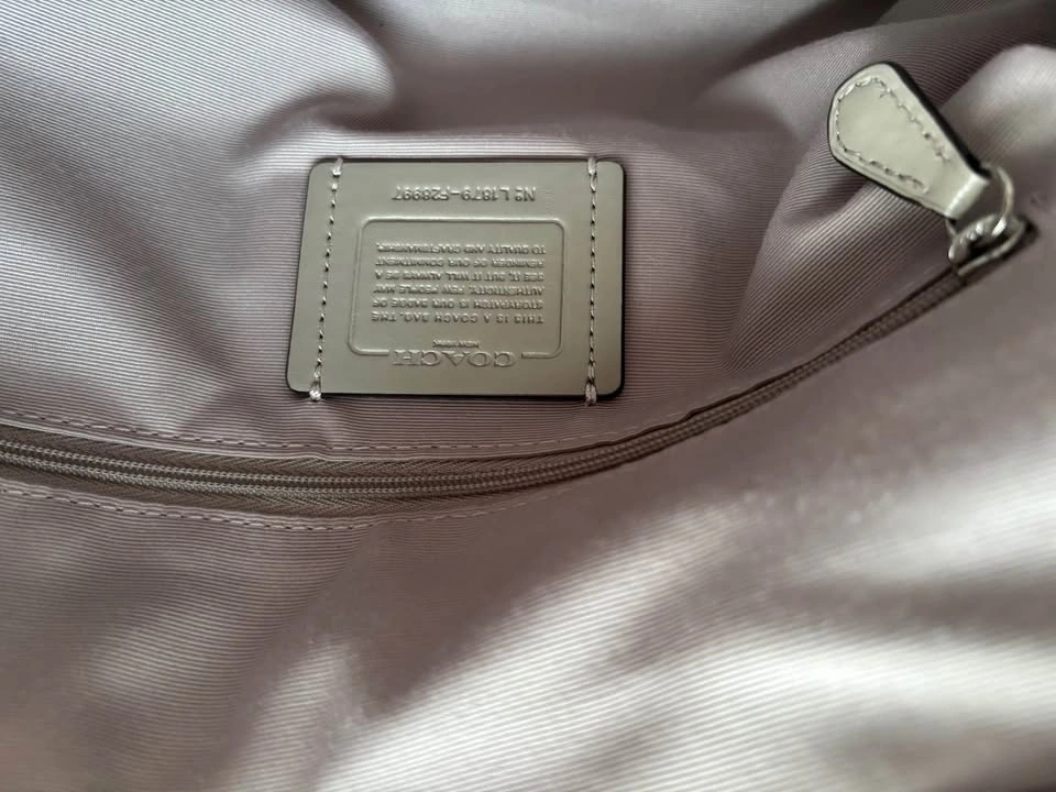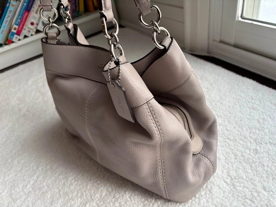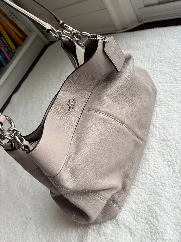 Chic Coach shoulder bag in cream leather. Features elegant silver hardware. Ideal for daily wear! In excellent barely used condition.
