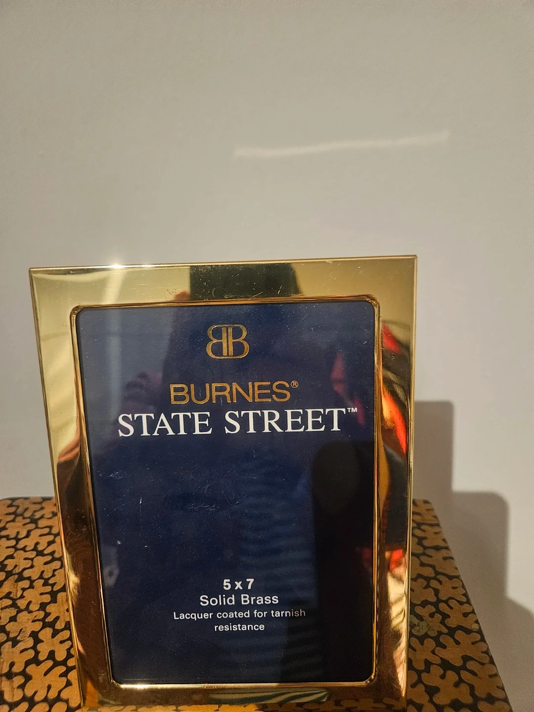 This is a 5x7 picture frame from Burnes State Street. It's made of solid brass with a lacquer coating for tarnish resistance. Displays photos vertically or horizontally.