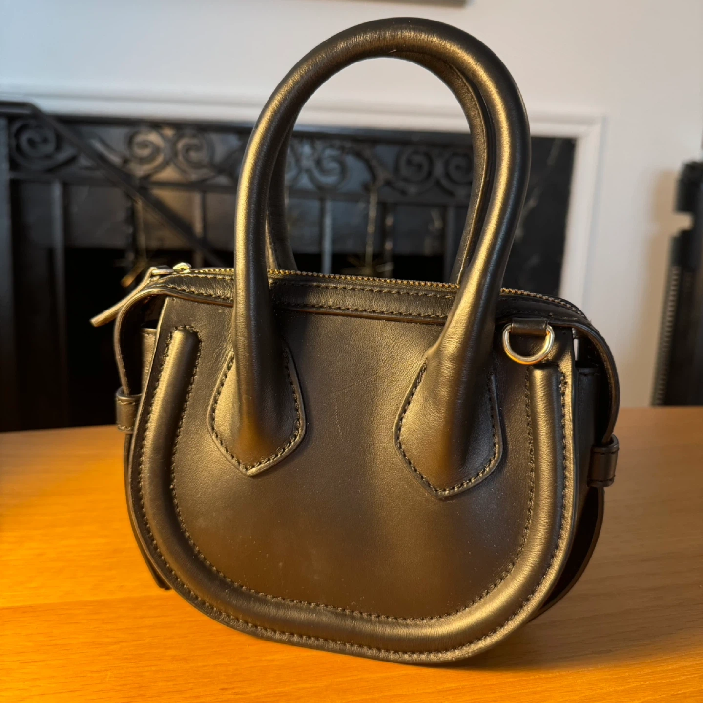Selling a cute black mini dome handbag! It's in great condition and perfect for carrying your essentials. The bag features a top handle and a zipper closure.