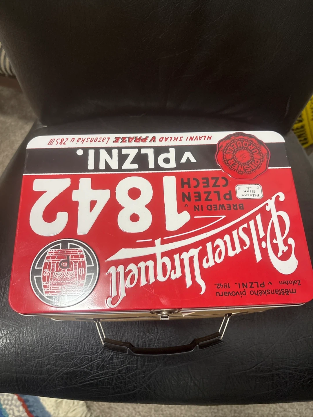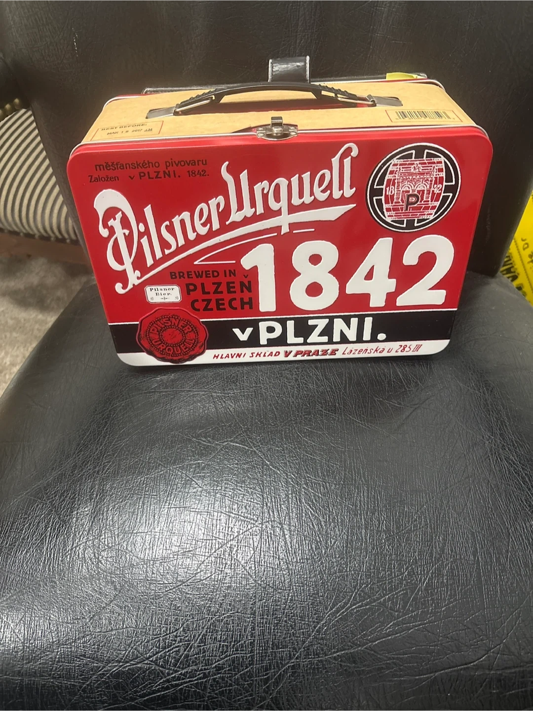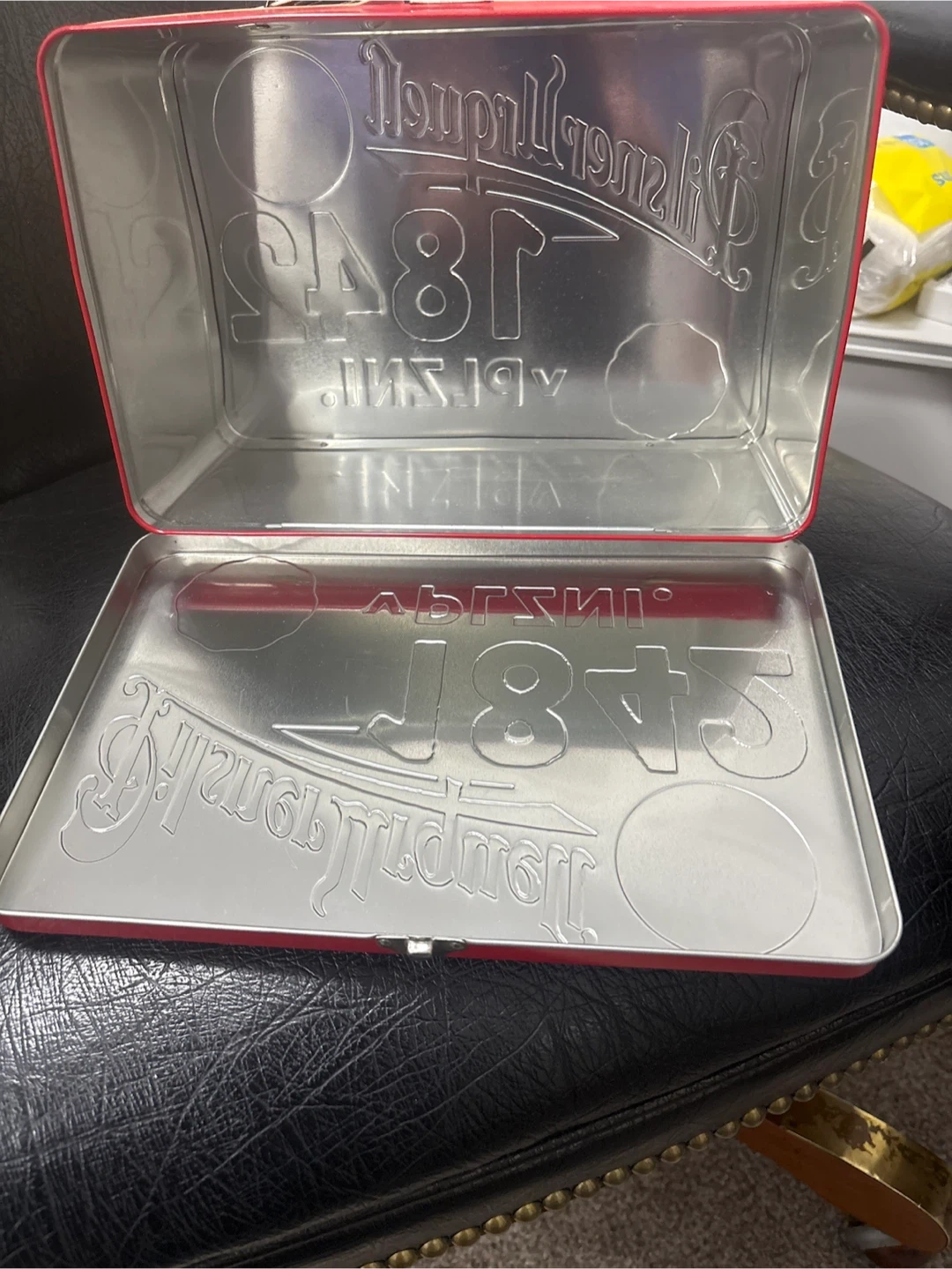 This is a Pilsner Urquell 1842 tin lunch box. It's embossed with the Pilsner Urquell logo and "1842". The interior also features embossed branding. It has a metal clasp and handle for carrying. This tin could be used for storage or display!