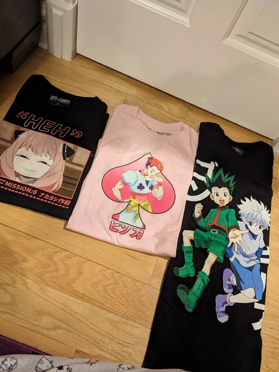 Bundle includes a medium pink Hunter x Hunter Hisoka shirt, a large black Spy x Family Anya shirt, and a medium black Hunter x Hunter Gon and Killua shirt. All are in excellent condition, unisex shirts. 5 dollars each or take all three for 10 dollars.
