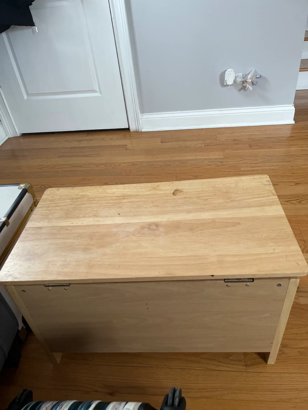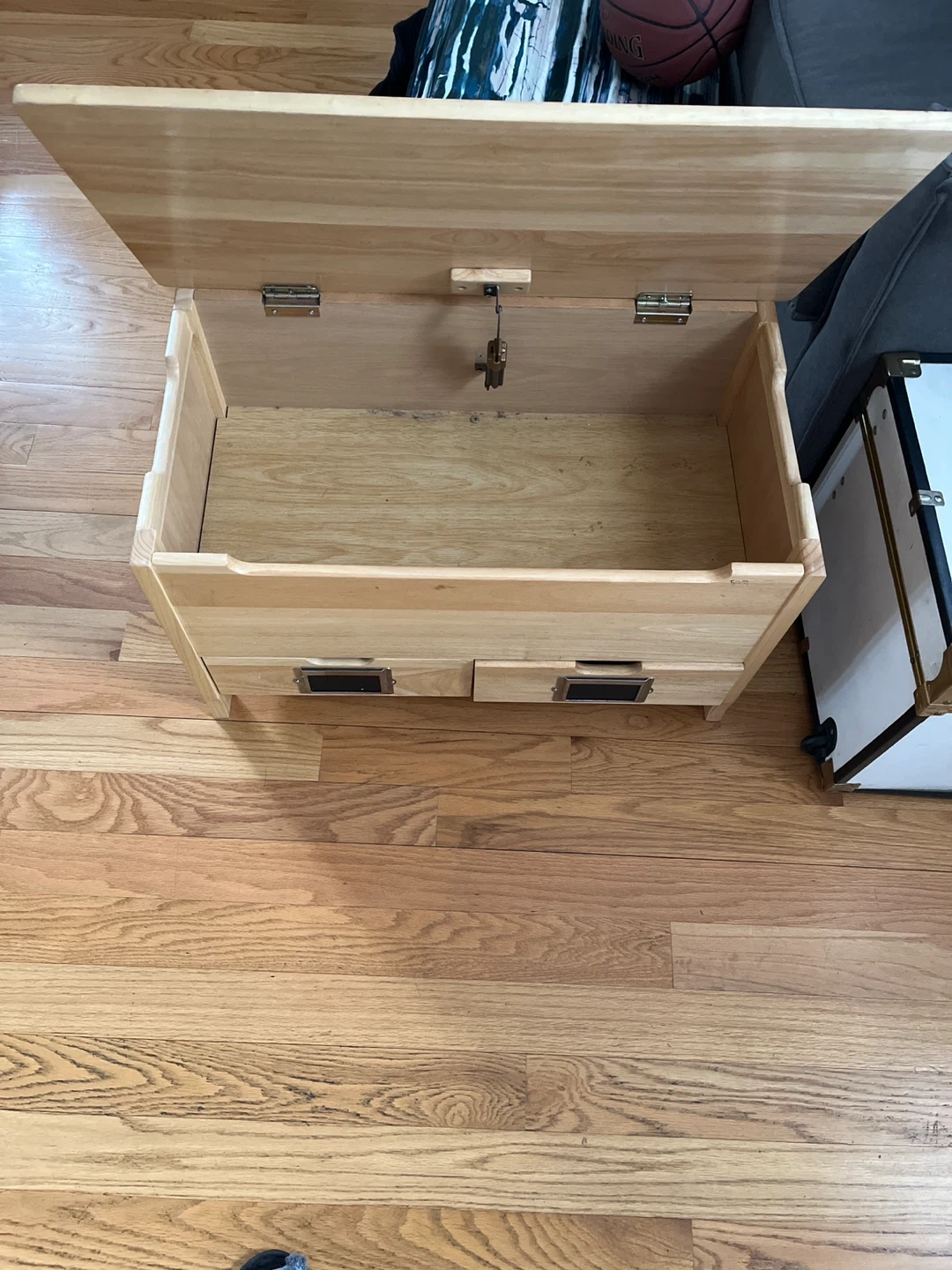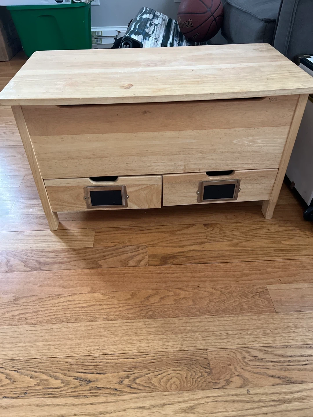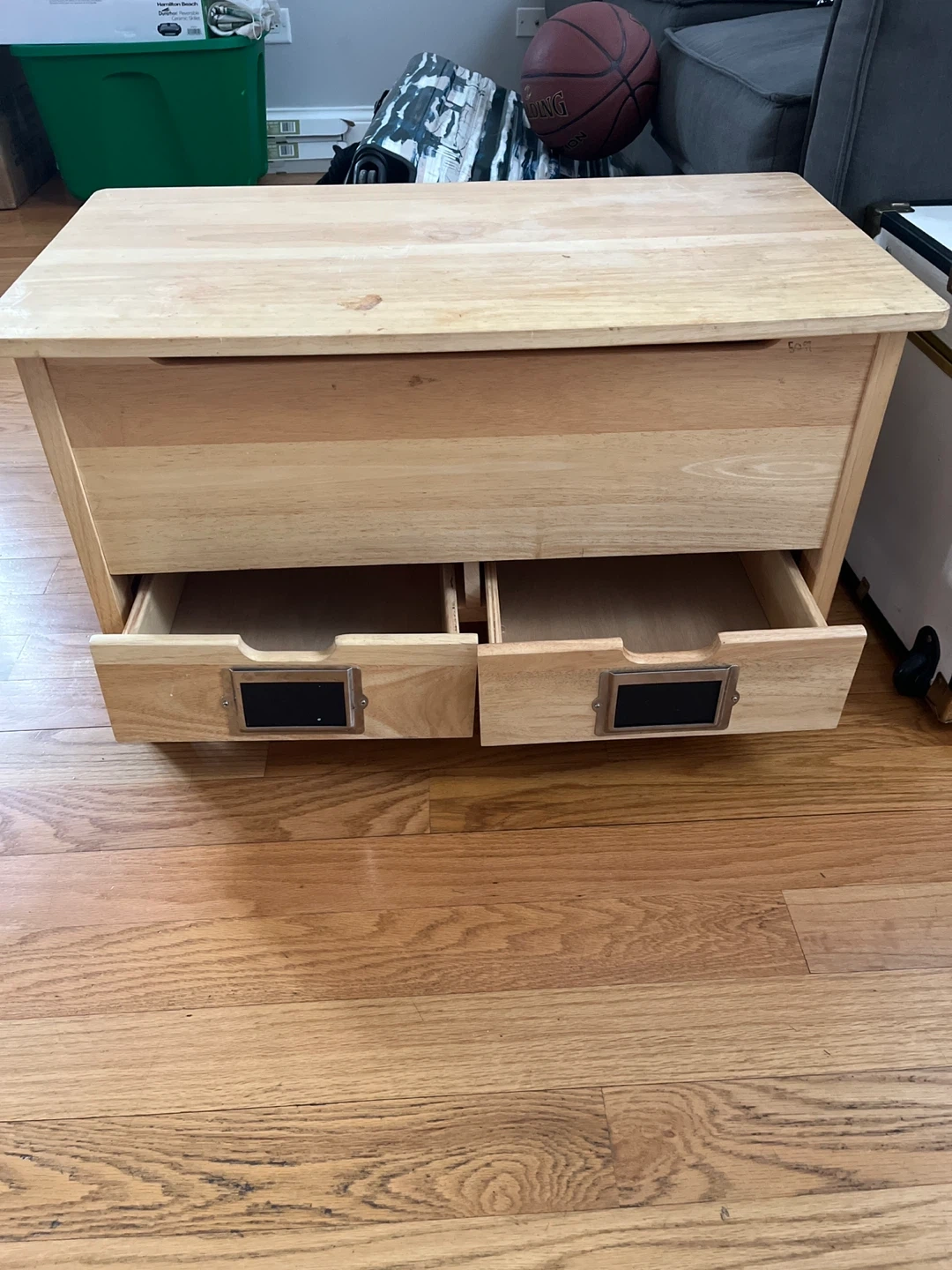 This wooden toy box is made of light-colored wood. It features a hinged lid for easy access and two drawers at the bottom with metal label holders. It's perfect for storing toys or blankets!