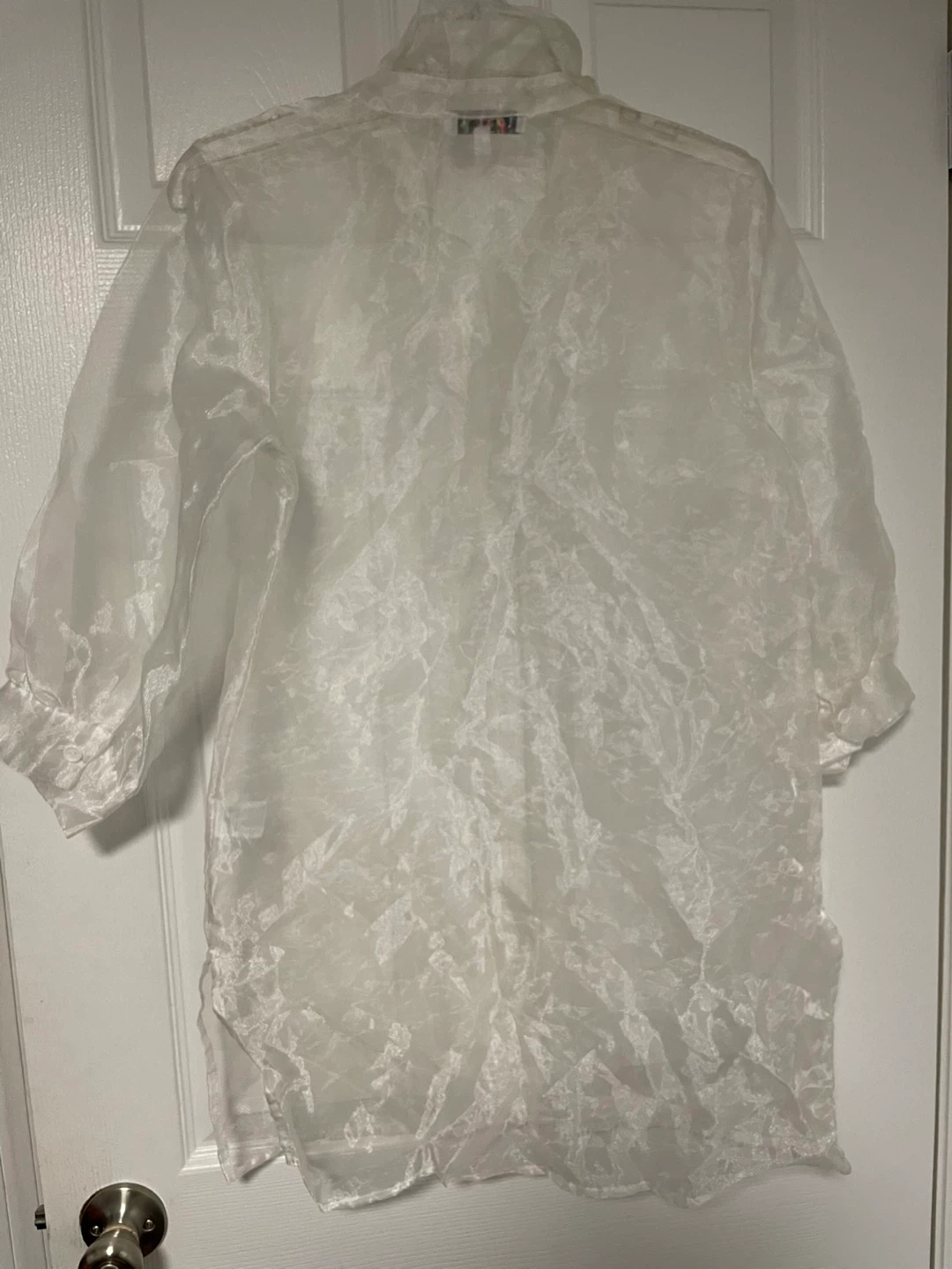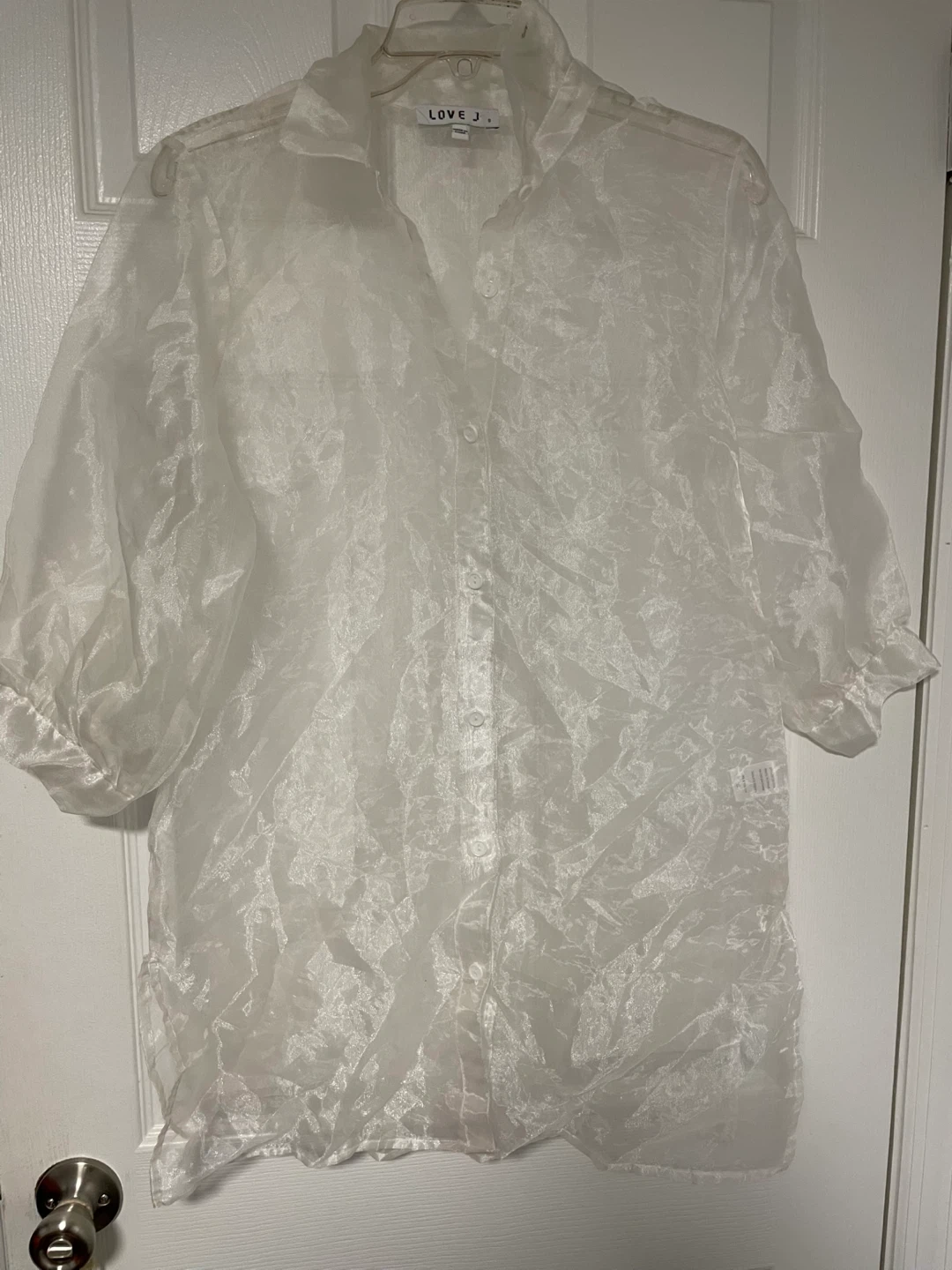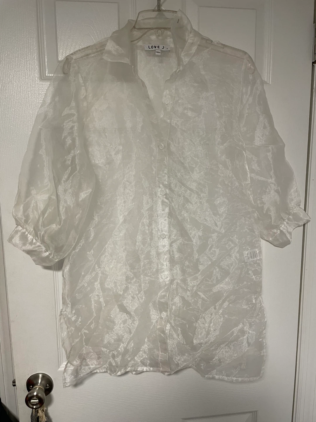 Selling a LOVE J. white sheer blouse in size small! It's in great condition and perfect for layering or wearing as a stylish cover-up
