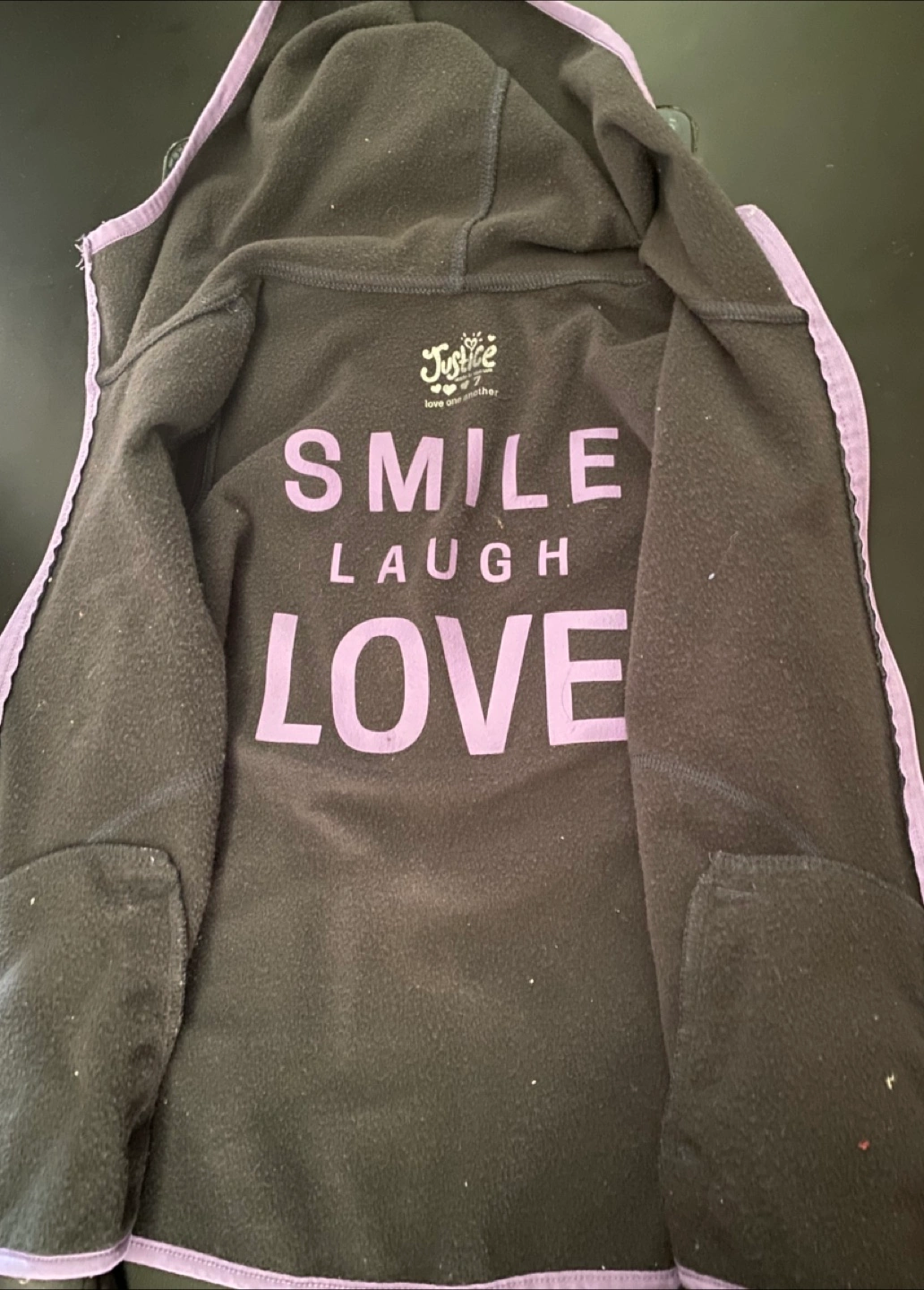 Black zip-up hoodie. Purple accents. Smile Laugh Love graphic. Good condition. Size 7