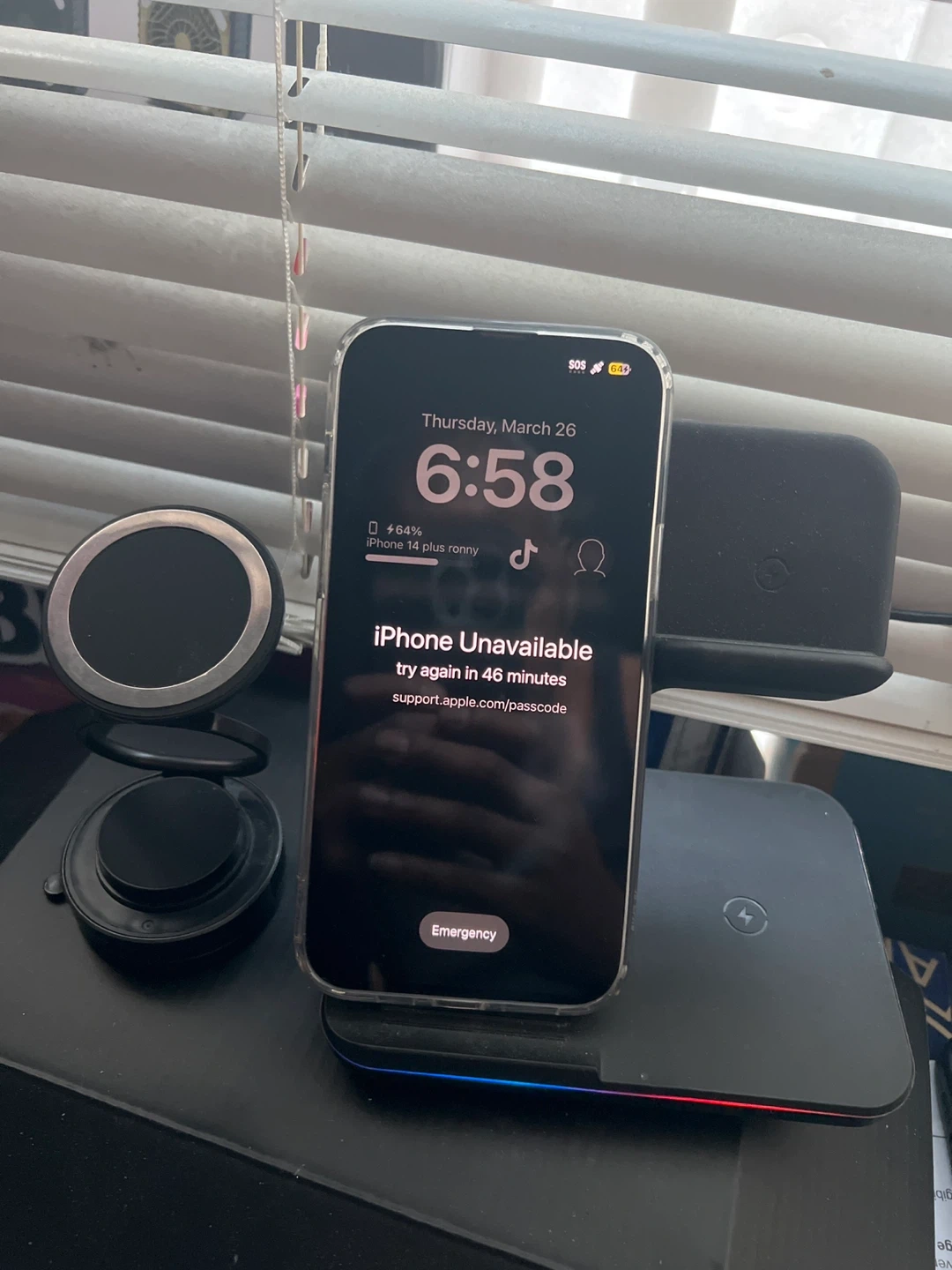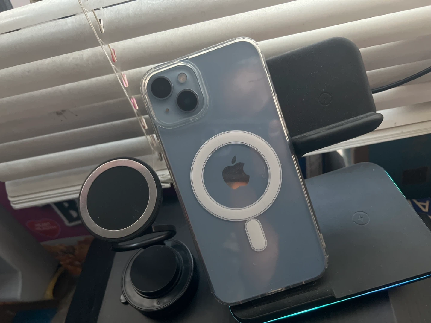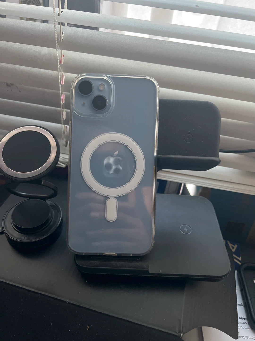 iPhone 14+ with a clear MagSafe case with the following for iPhone 14 Plus,,. It features a built-in magnetic ring for easy attachment to MagSafe accessories. The case offers protection while showing off your phone's design. Works well but locked to its owner.,, Selling as is.