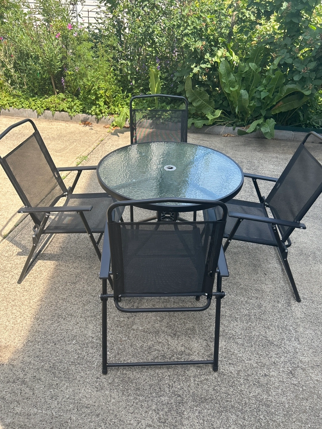 29Selling an outdoor dining set that includes a round glass table and four chairs. The chairs have a mesh backing and are foldable for easy storage. The set is in good condition and perfect for enjoying meals outside!