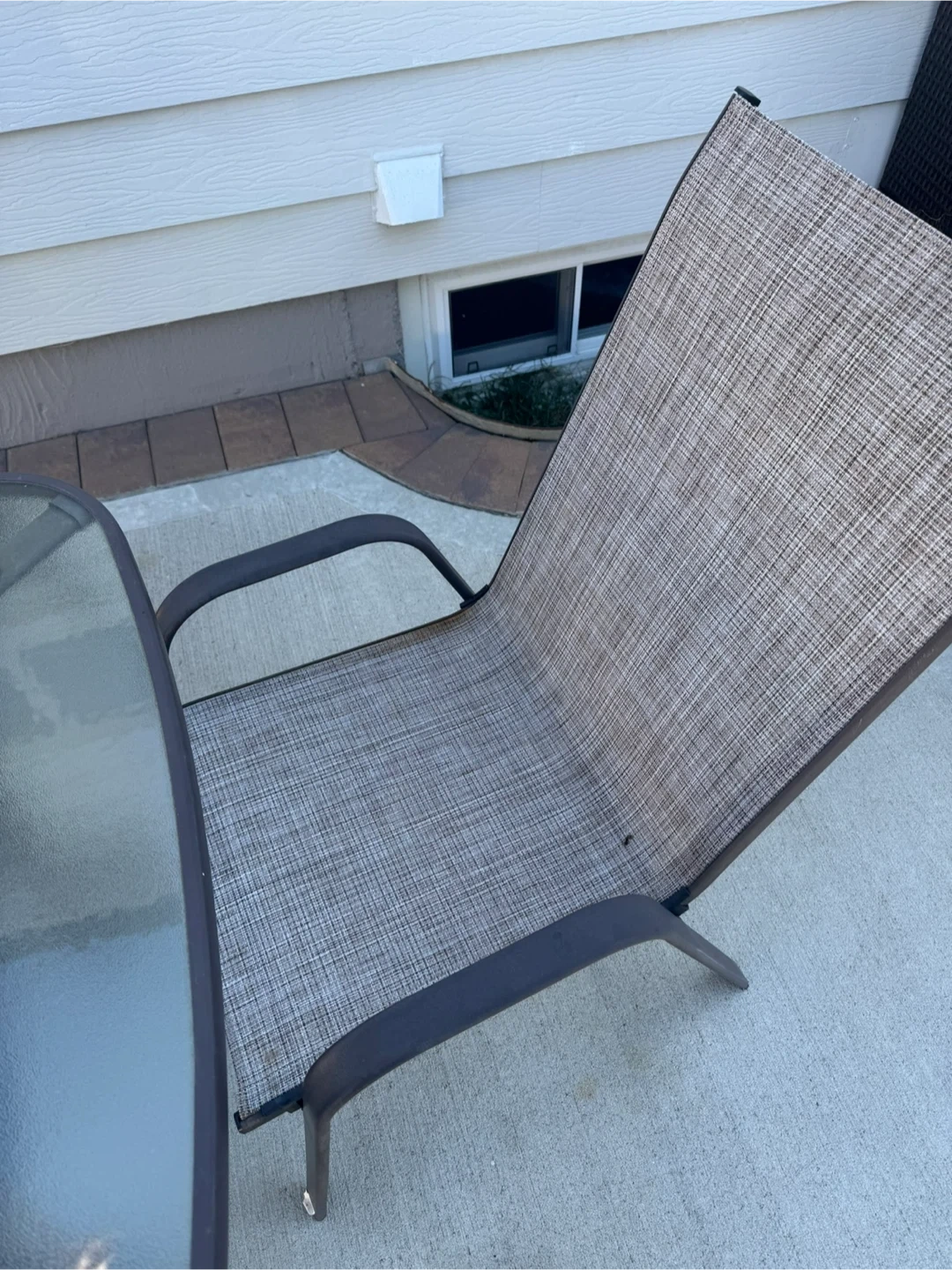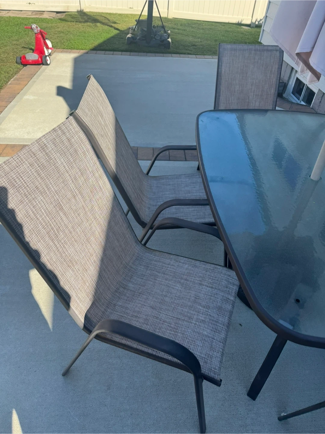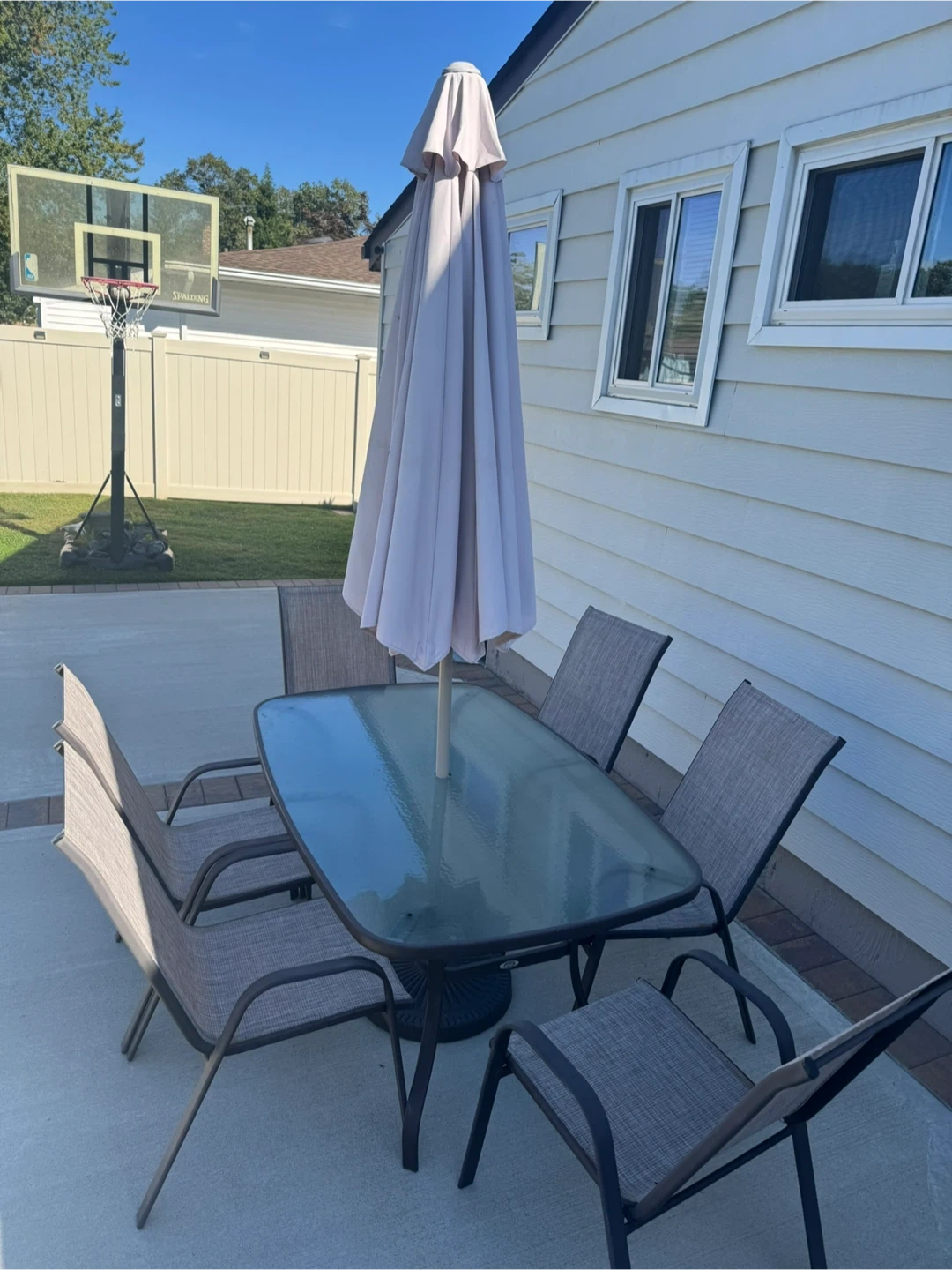 Selling a complete outdoor patio dining set that includes a glass-top table and six comfortable chairs. The chairs have a neutral-toned, woven fabric and sturdy frames. Perfect for enjoying meals outside! Also comes with the umbrella
