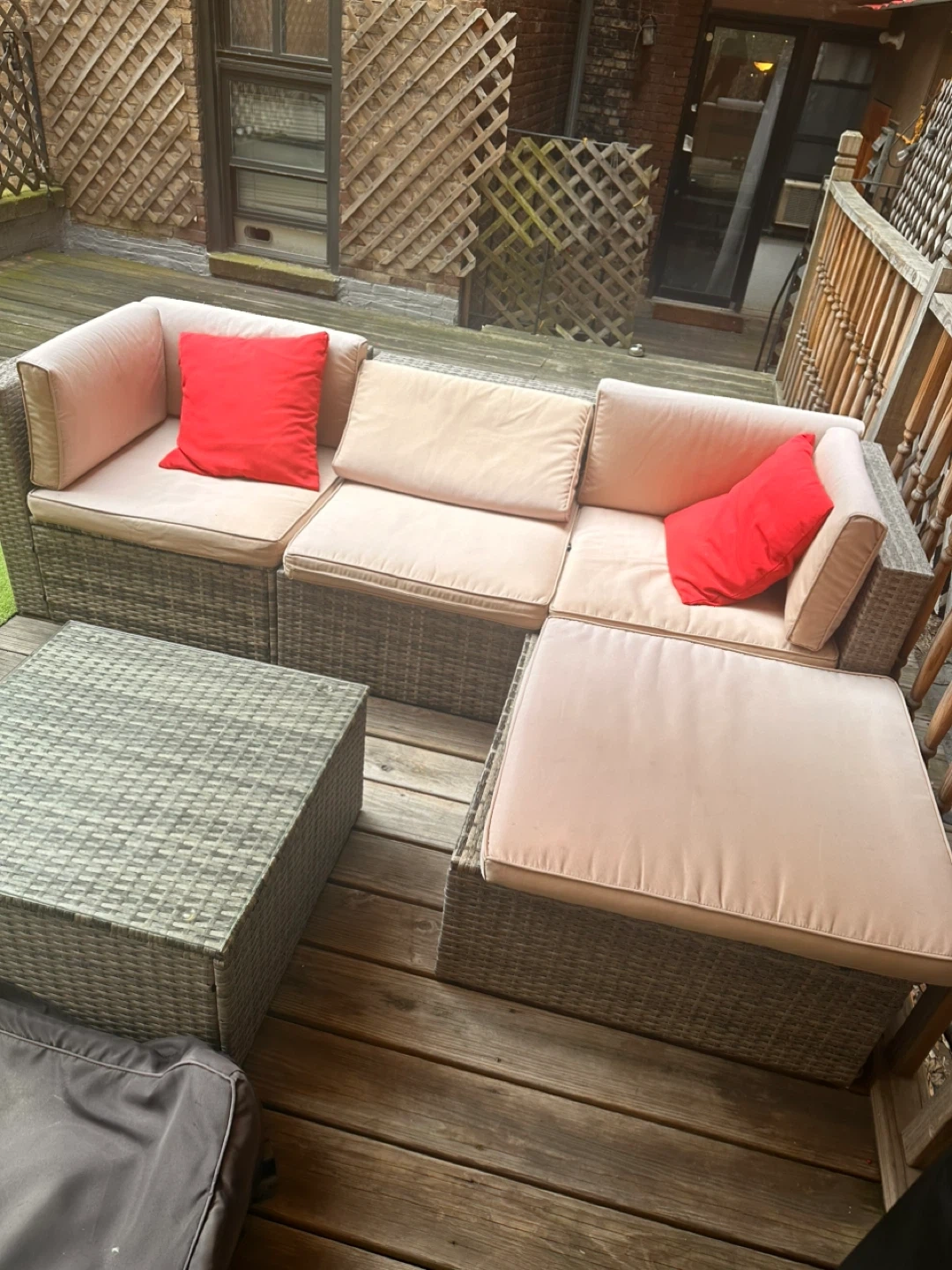 198Selling a used outdoor patio furniture set. It's in good condition and perfect for relaxing on your deck or patio. Includes a sectional sofa, ottoman, and coffee table.