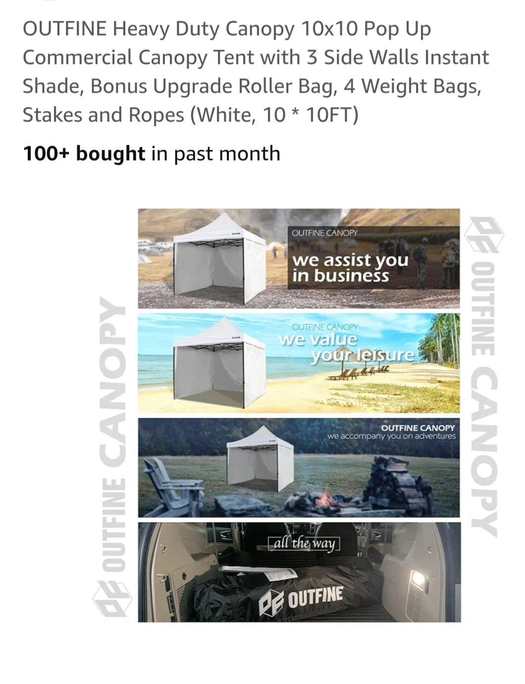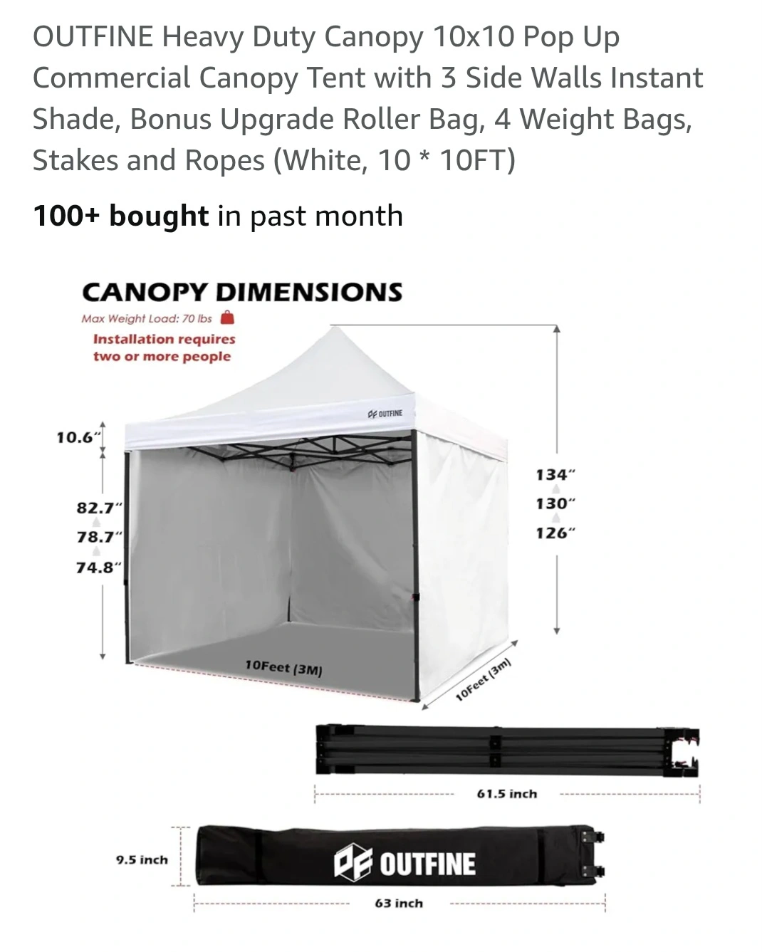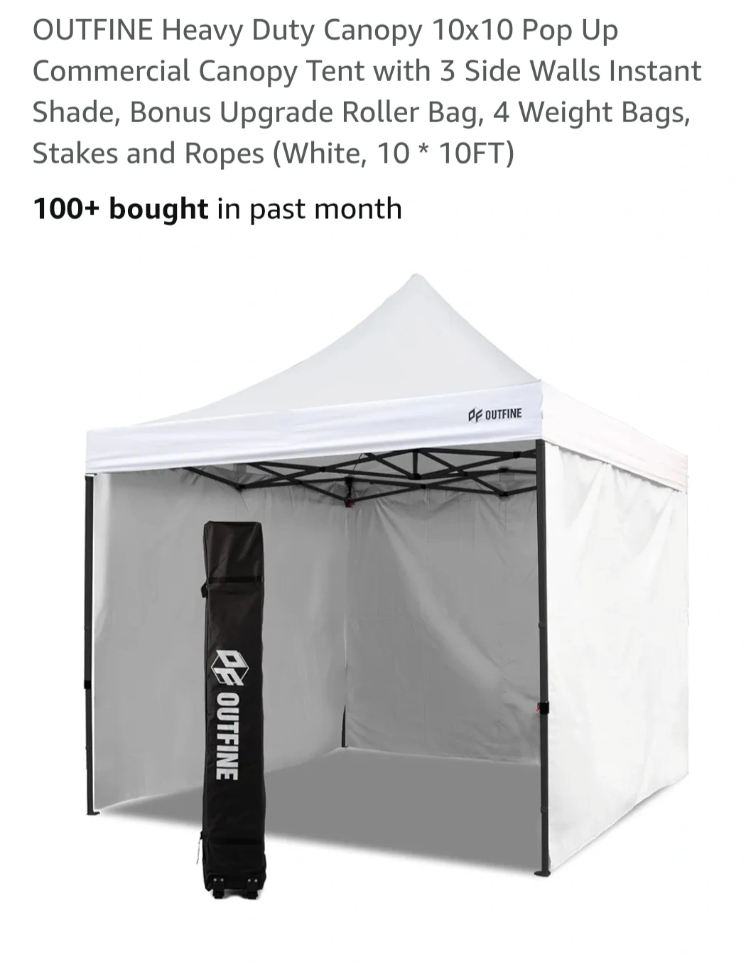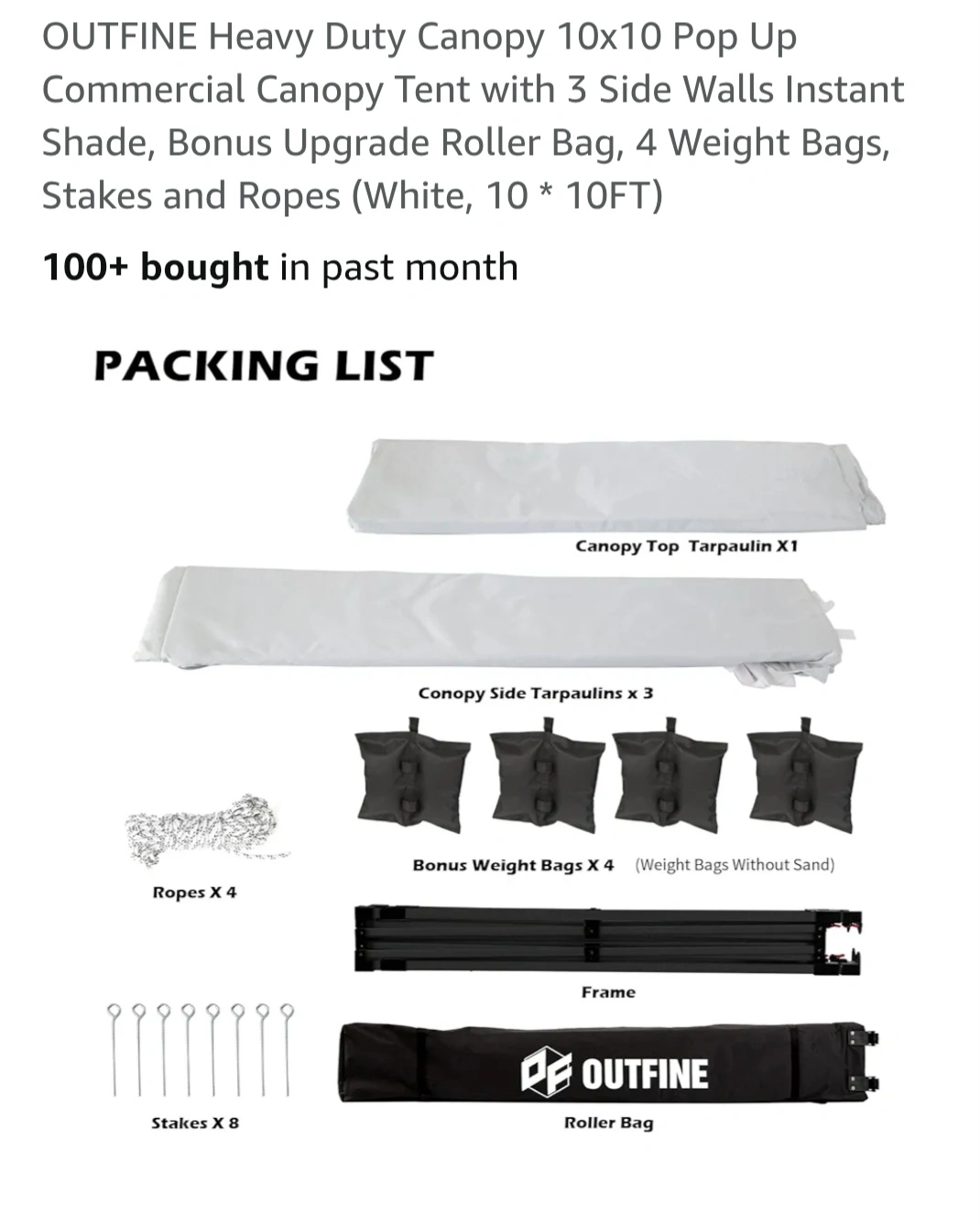 Selling a white OUTFINE heavy duty canopy tent, perfect for outdoor events! It's a 10x10 pop-up commercial canopy tent that comes with 3 side walls for instant shade. Plus additional 8 pairs of 20lbs. weights. Great for picnics and pop-up events. Easy to assemble and store. It also includes a bonus upgrade roller bag, 4 weight bags, stakes, and ropes. The canopy features: -UPF 50+ Block 99% UV -Thicken Metal Legs -Sturdy Cross-truss Structure Technology -Easy Height Adjustment -Corner Reinforcement -Anti-pinching Quick Lock Slide Button -Anti-rust Coating -100% Waterproof