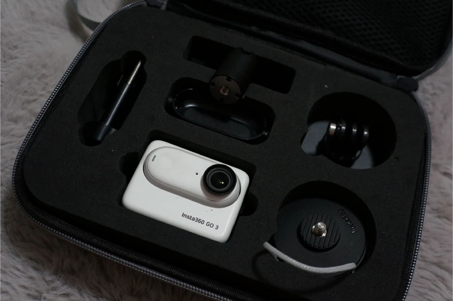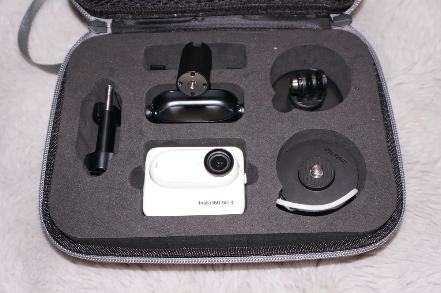 This is an Insta360 GO 3 action camera in white. It comes with a carrying case and several accessories, all neatly organized. It's ready for your next adventure!