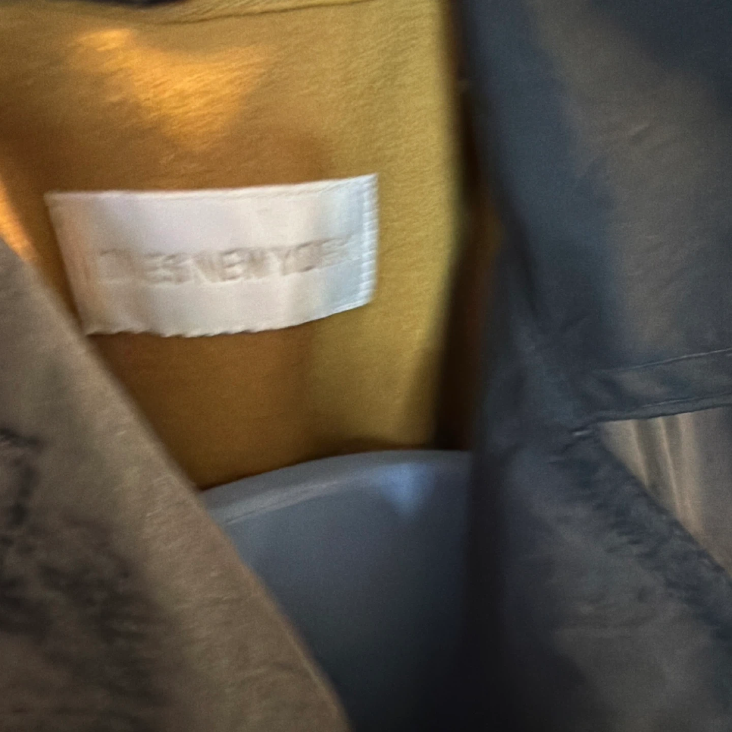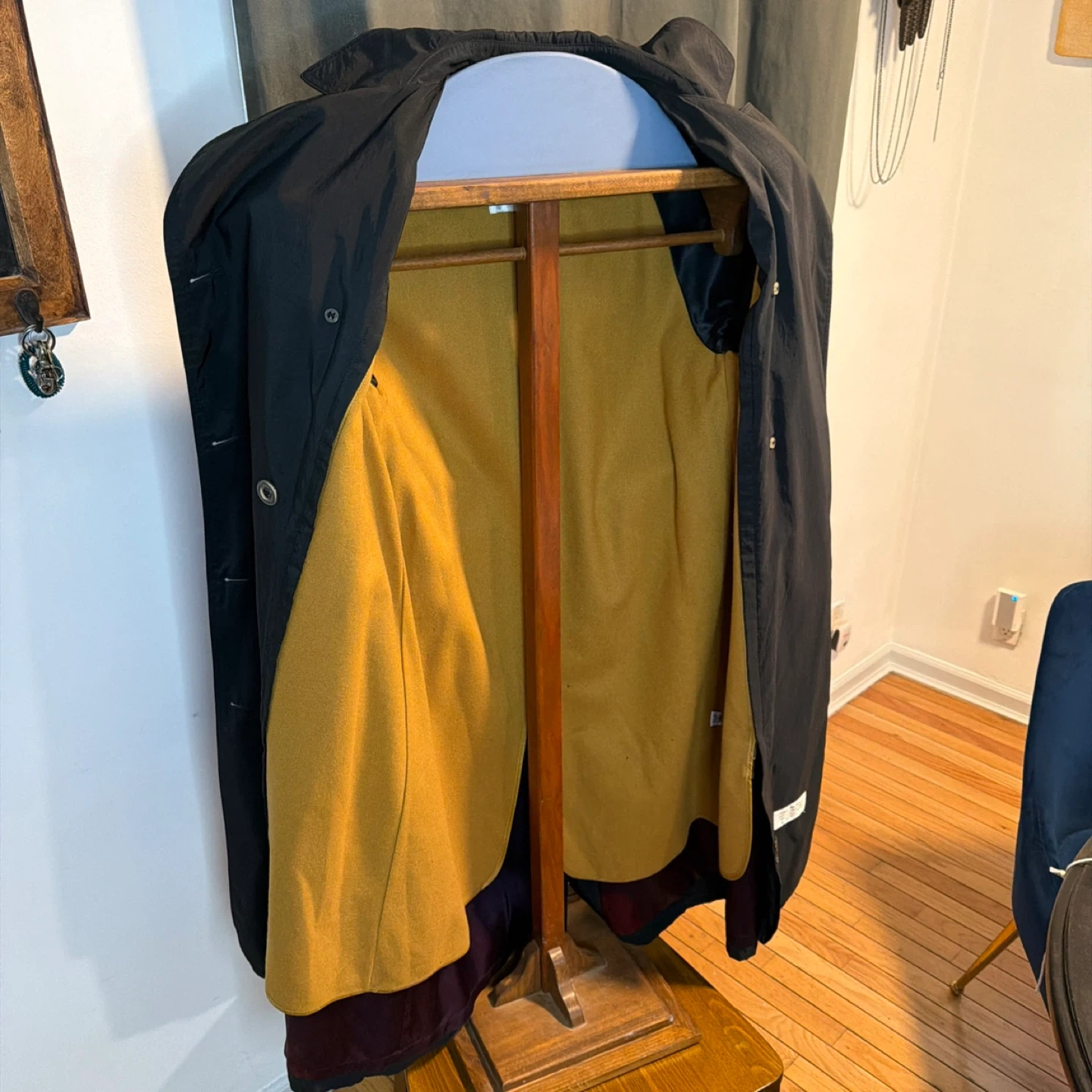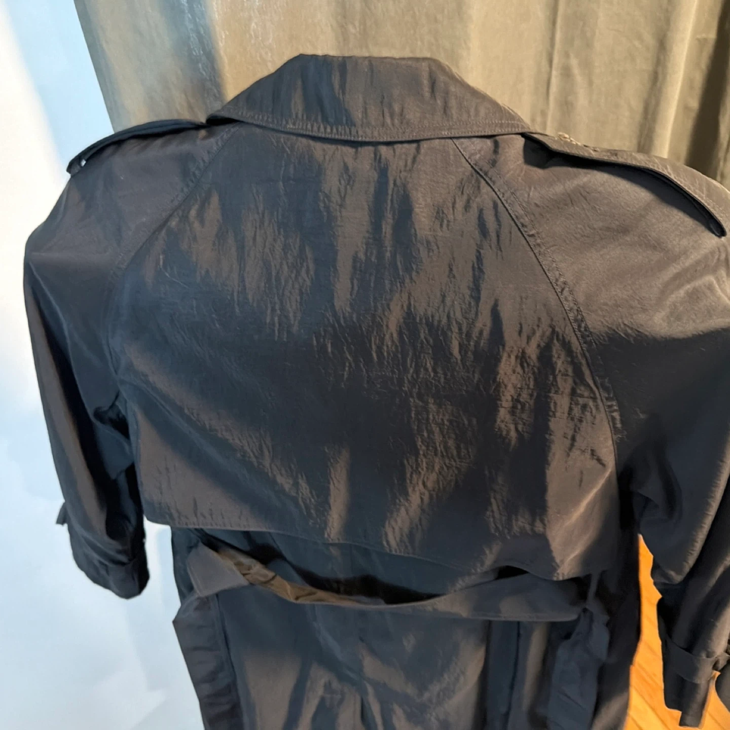 This is a black trench coat from Jones New York. It features a contrasting bright yellow lining. Professionally dry clean only, made in the USA. Double-breasted with a belt closure.