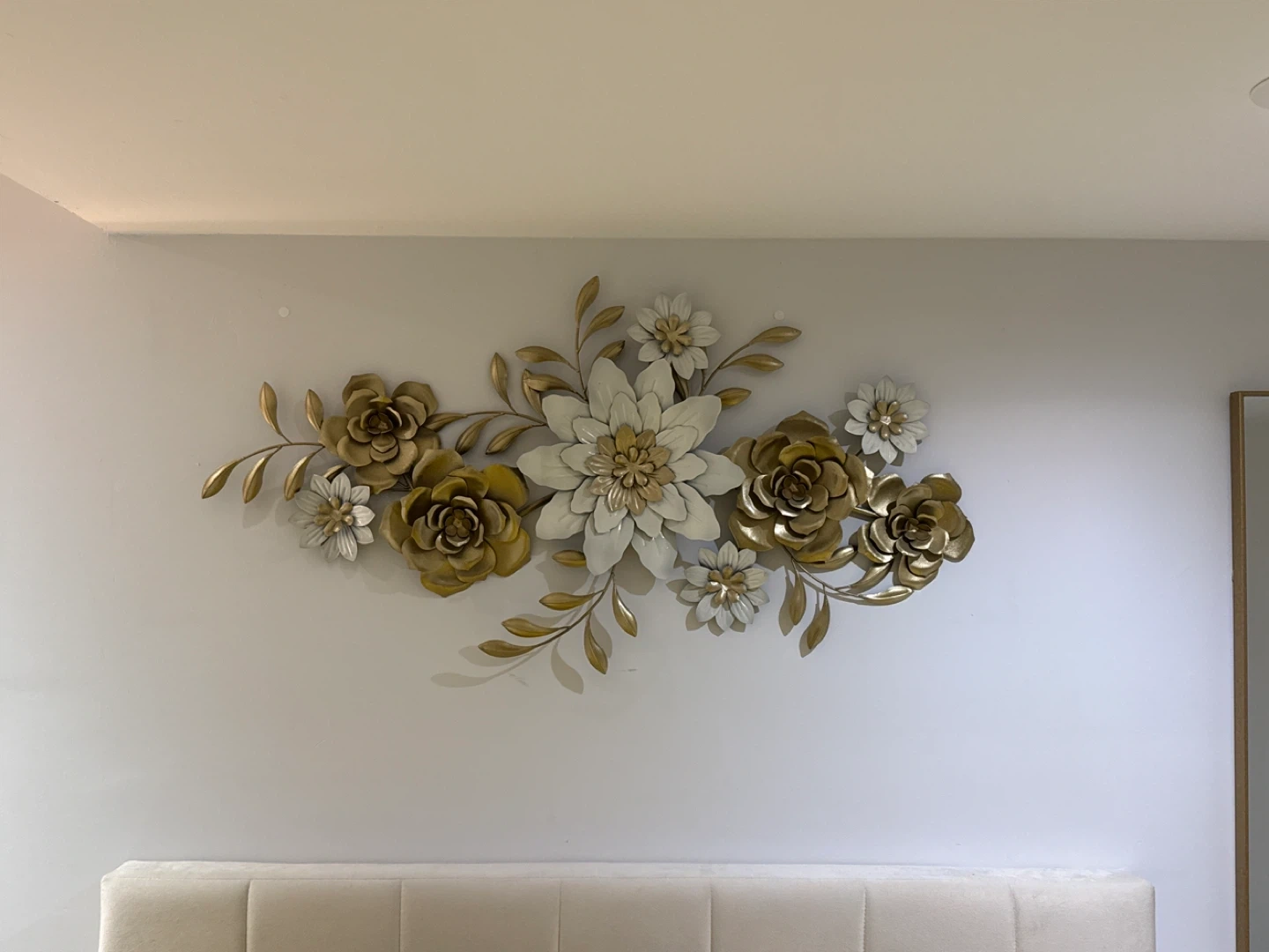 Add a touch of elegance to your home with this beautiful floral metal wall decor! The arrangement features a mix of gold and white flowers and leaves, perfect for any room in your house