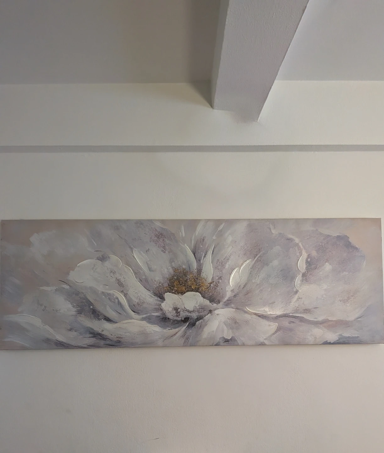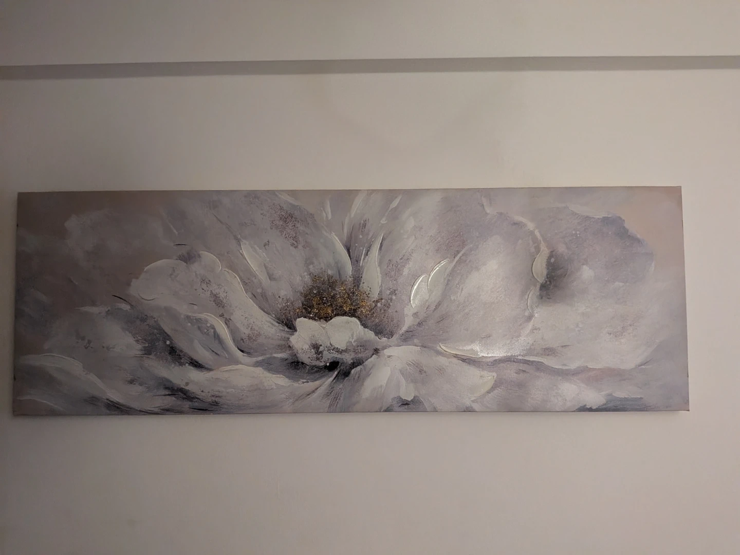 Beautiful abstract floral canvas print. Features large white and grey petals with gold accents in the center. This panoramic art piece adds a touch of elegance to any room. Ready to hang.