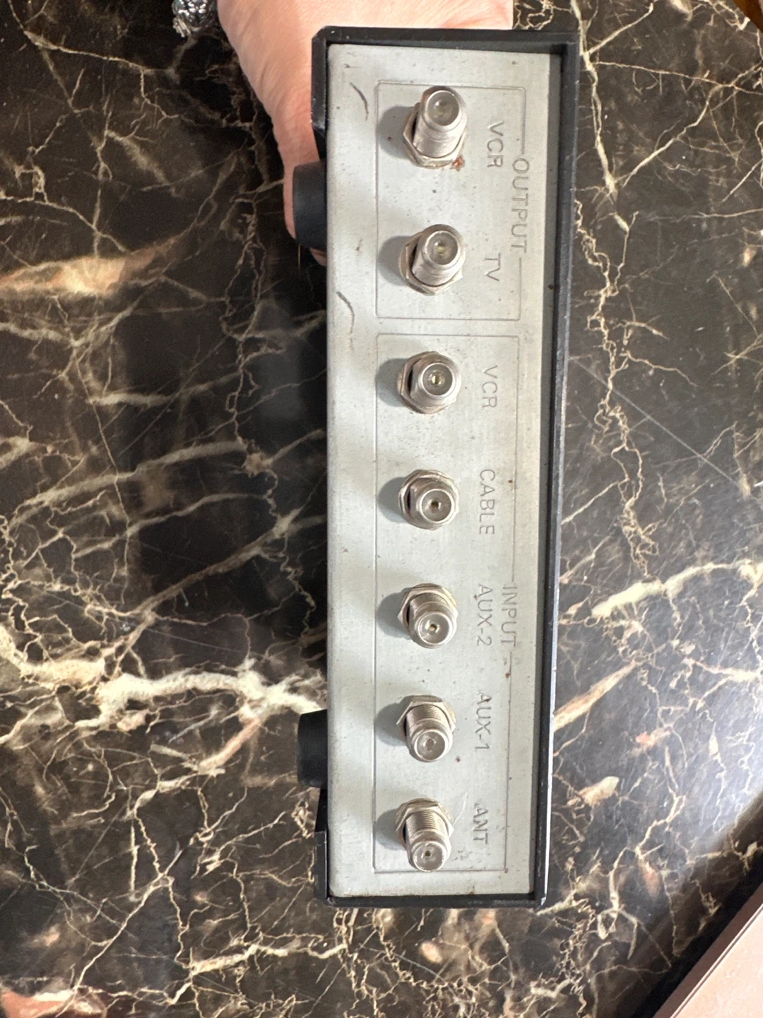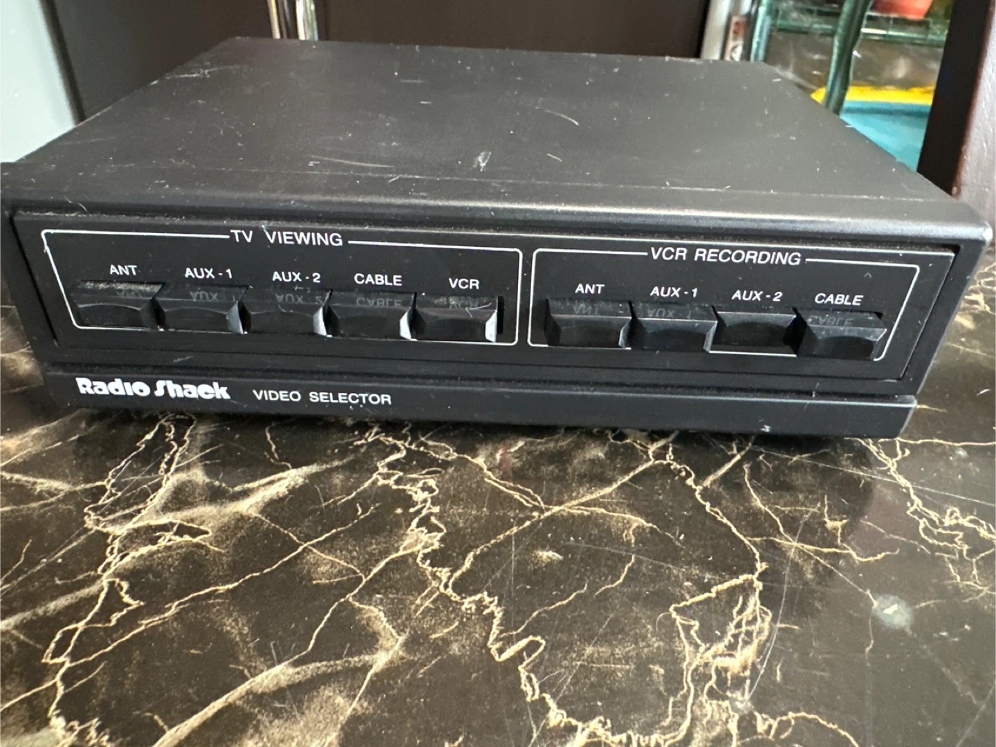 This is a Radio Shack Video Selector, model number 15-1266A. It's designed for TV viewing and VCR recording, with inputs for ANT, AUX-1, AUX-2, CABLE, and VCR. It also has outputs for TV and VCR.