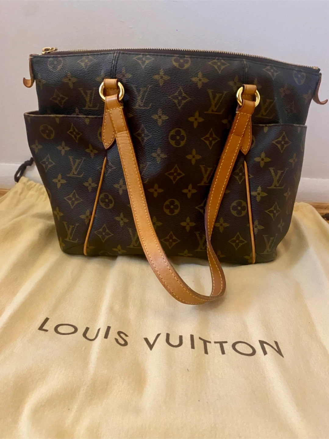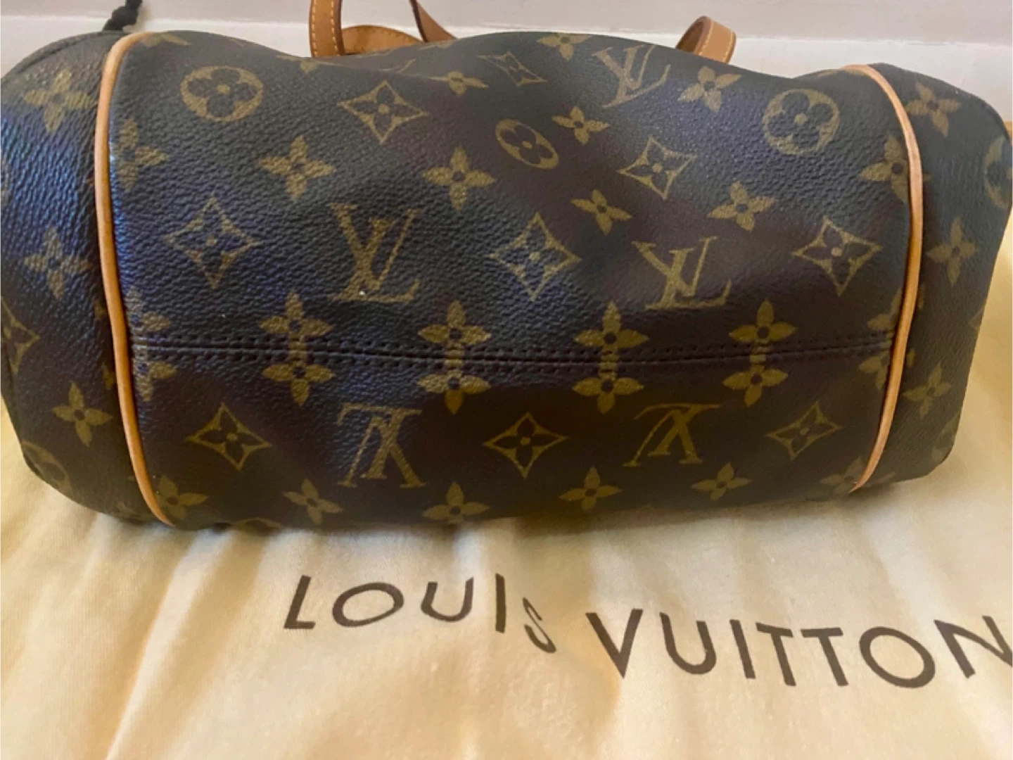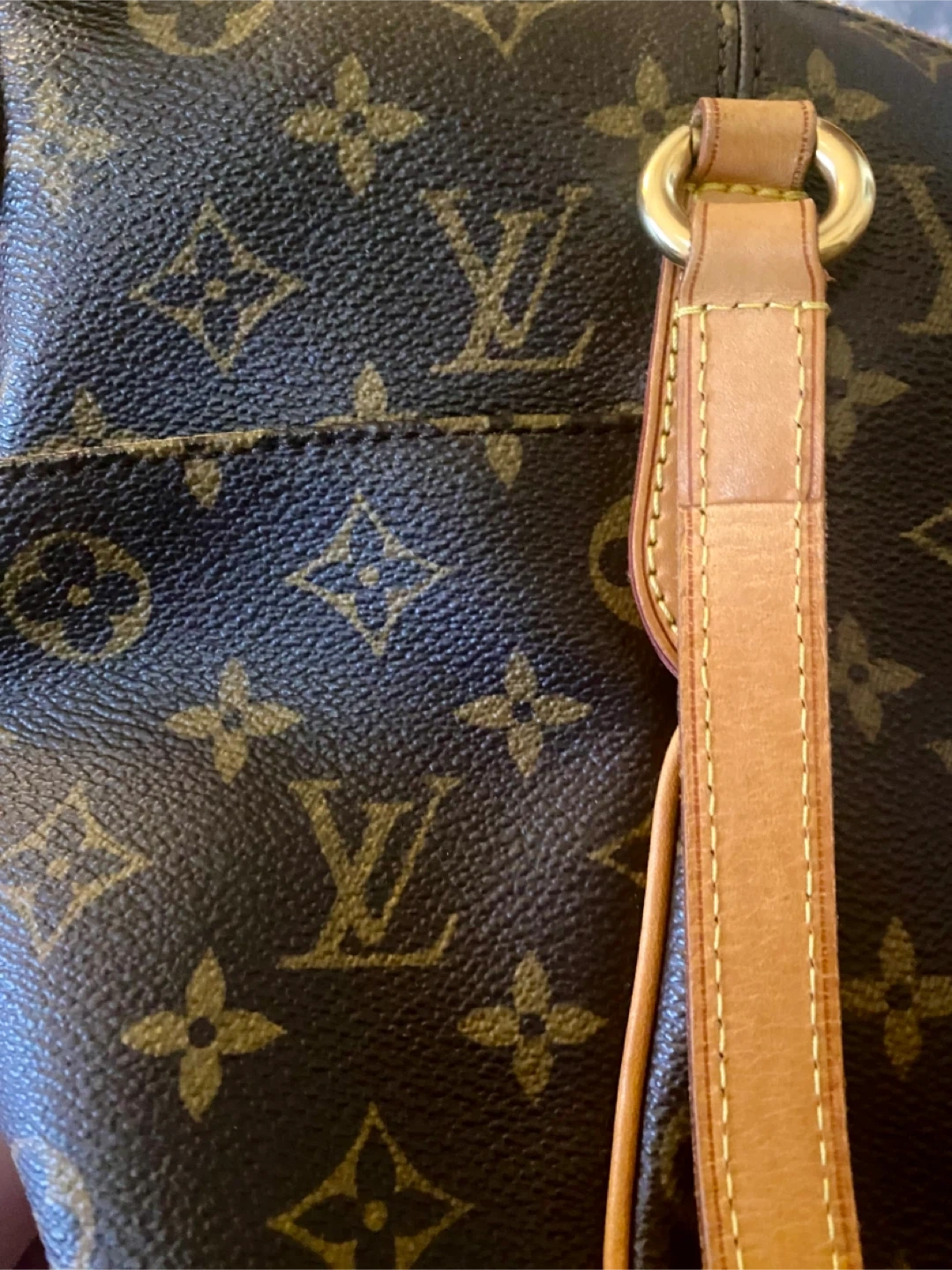 This is a Louis Vuitton shoulder bag in the classic monogram canvas. It features tan leather trim and gold-tone hardware. It's a stylish and practical everyday bag. Includes original dust bag.