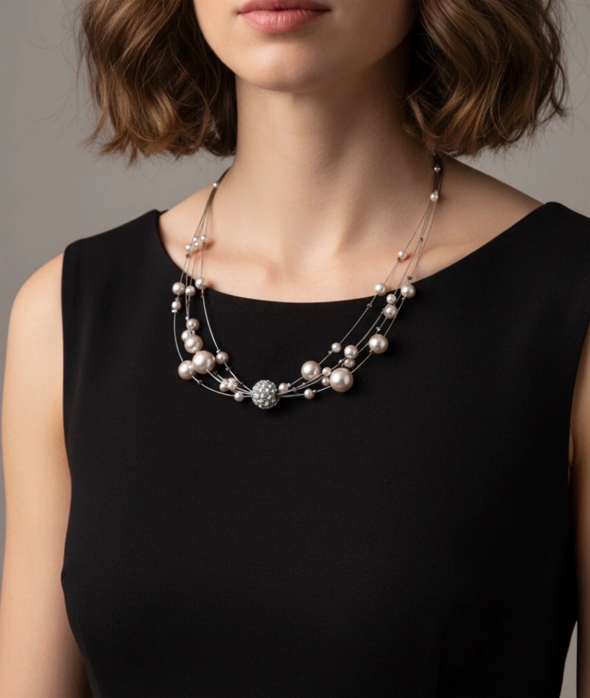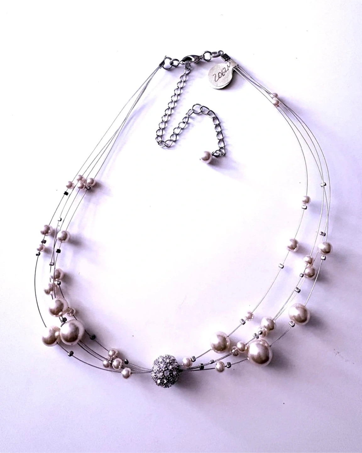 A pretty multi-strand necklace featuring faux pearls in varying sizes and a central sparkly rhinestone accent. The chain is silver-tone and includes an adjustable extender. It's a versatile accessory that adds a touch of glamour!