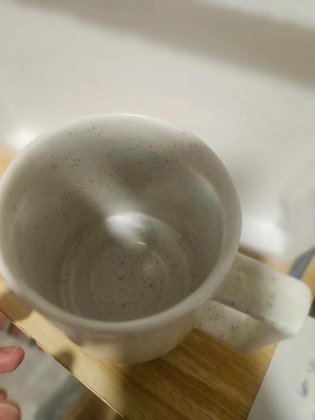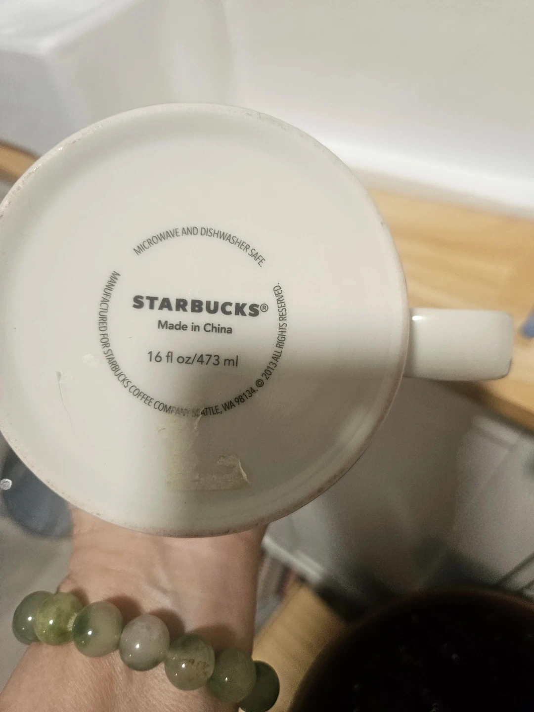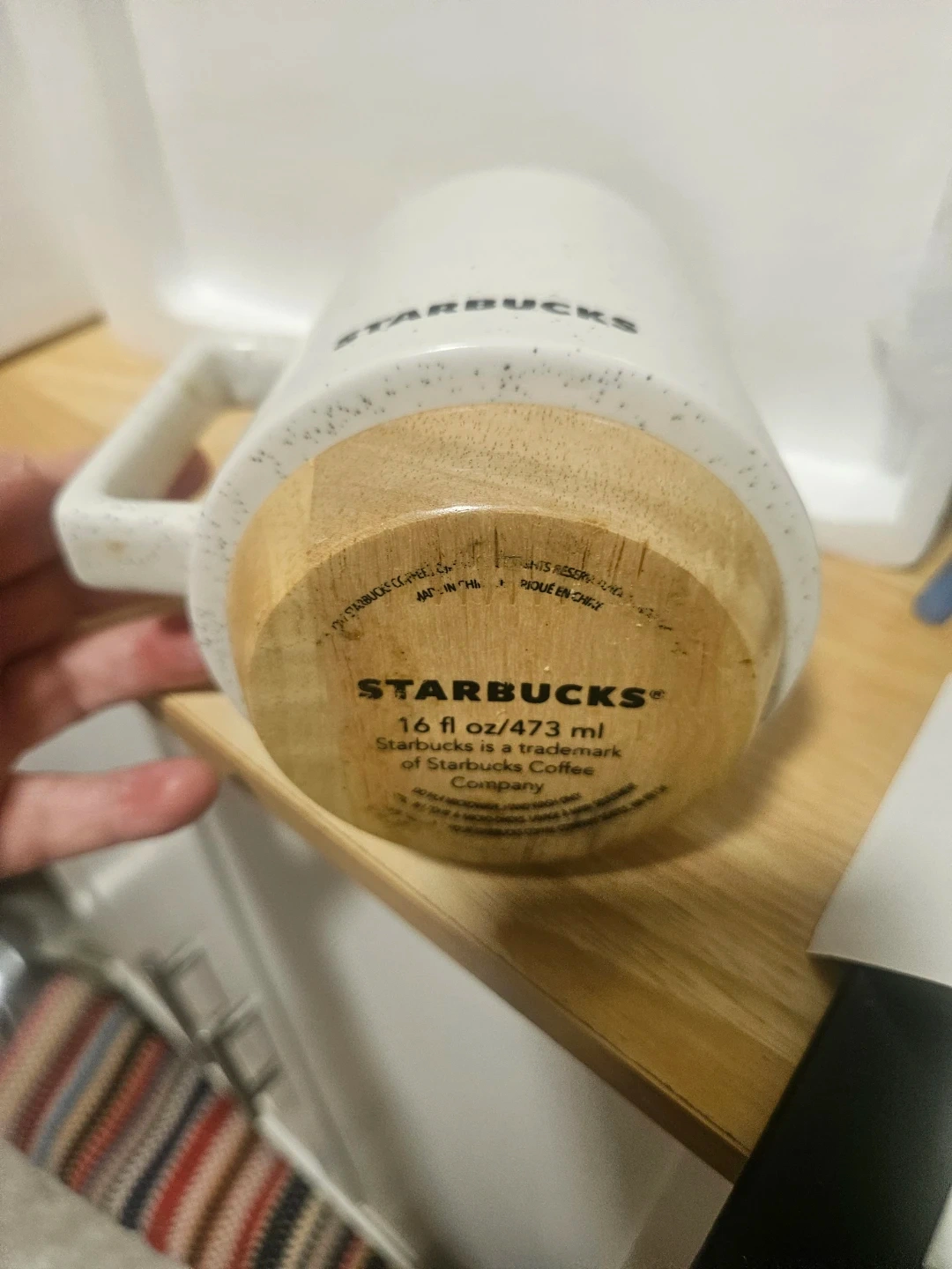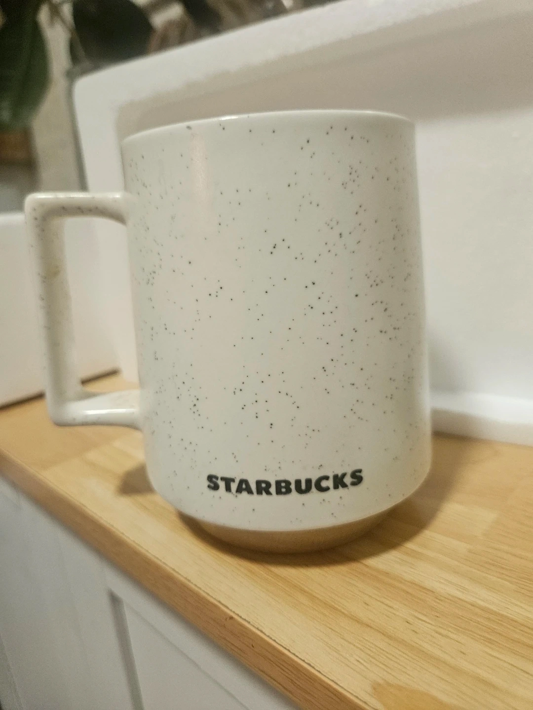 This is a Starbucks mug with a speckled design. It holds 16 fl oz or 473 ml. It's microwave and dishwasher safe. Great for enjoying your favorite hot beverages!