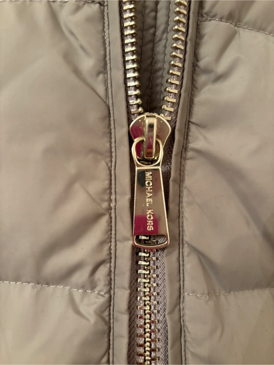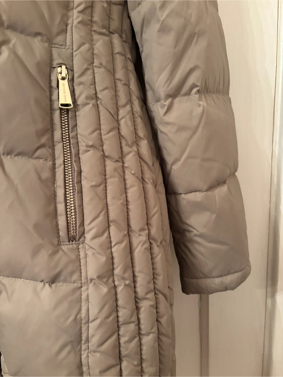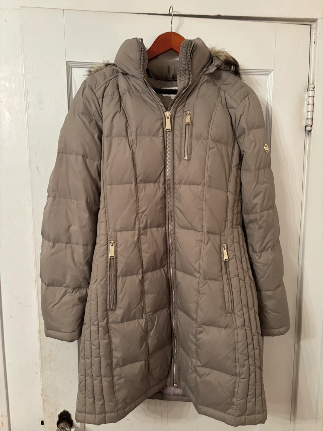 Tan Michael Kors puffer coat. Features a full zip front and zip pockets. Detachable fur-trimmed hood. Material is polyester. Mid thigh length. Size small. Never been worn.