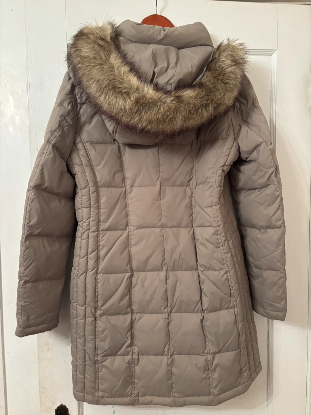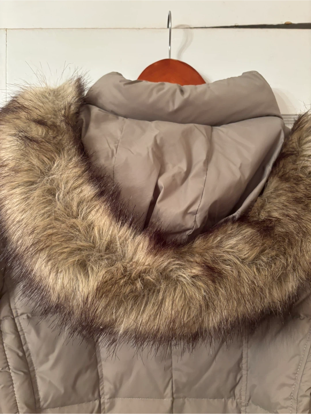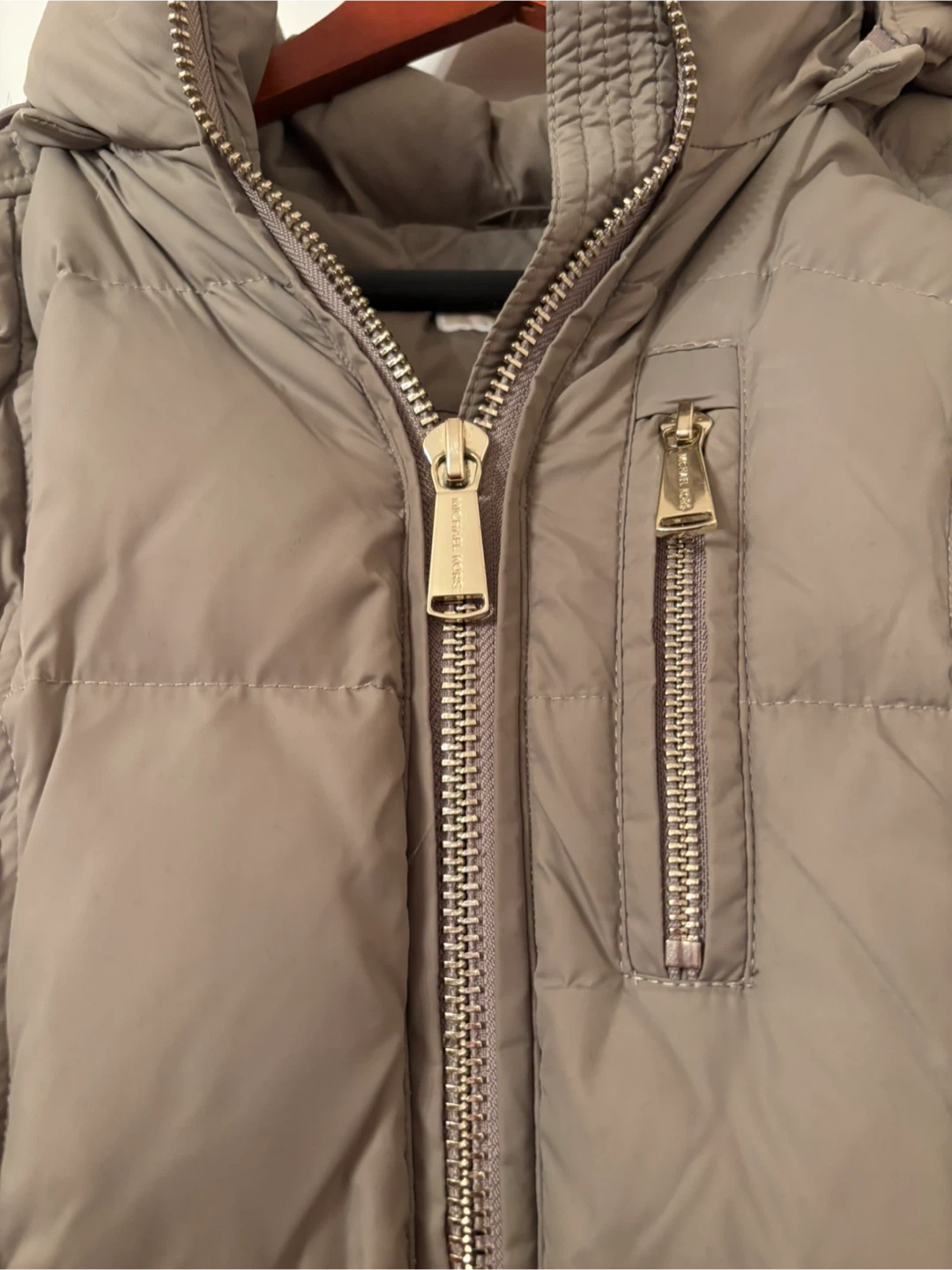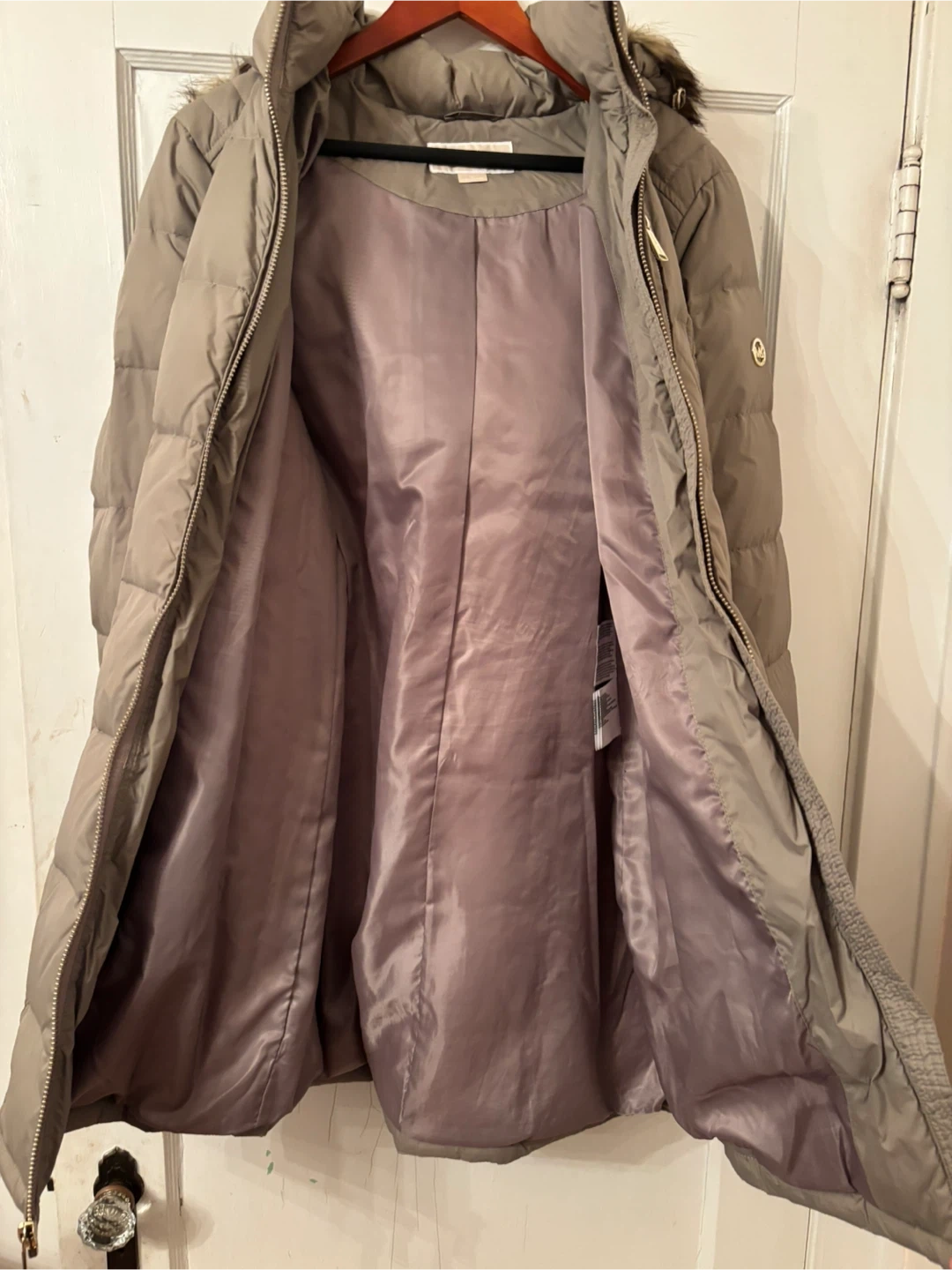 Tan Michael Kors puffer coat. Features a full zip front and zip pockets. Detachable fur-trimmed hood. Material is polyester. Mid thigh length. Size small. Never been worn.