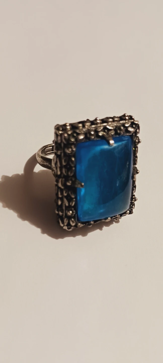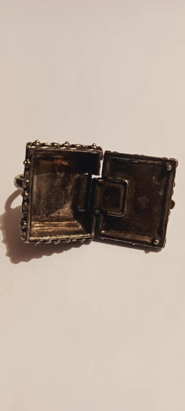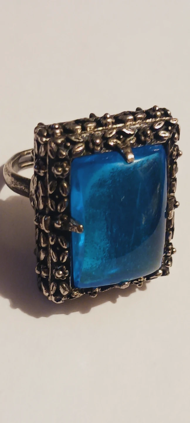 This vintage ring features a square blue stone set in a decorative silver-tone metal. It's a locket style ring that opens up! Size 7. Excellent condition. ALL MY PRICES ARE NEGOTIABLE !