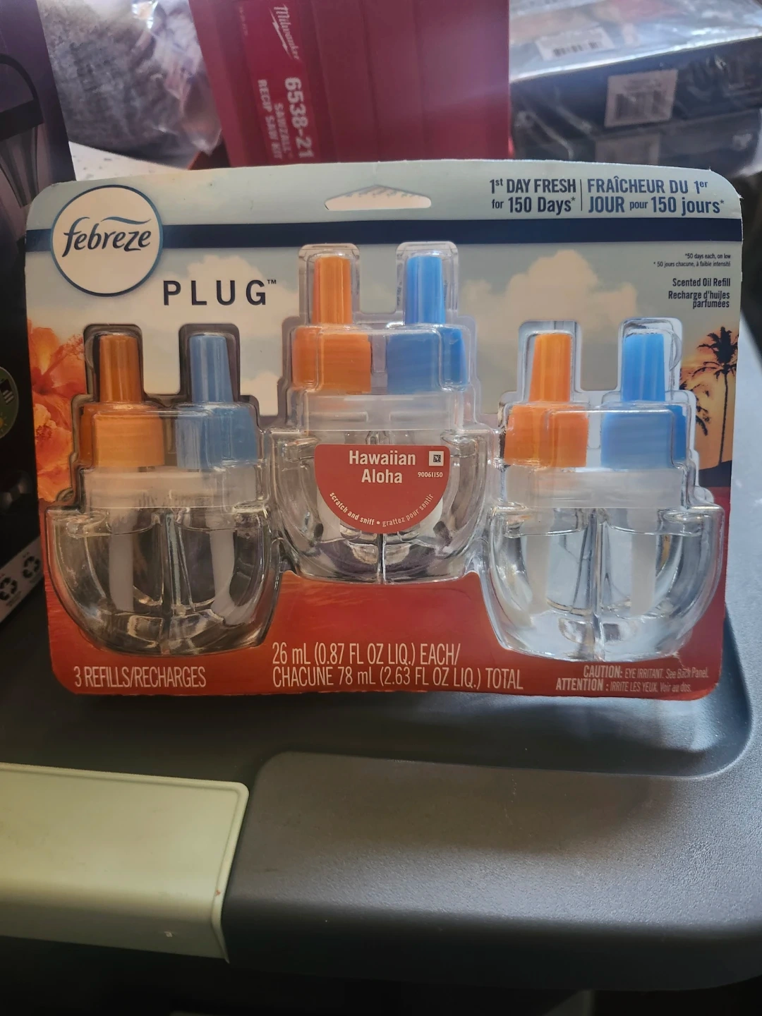 Febreze Plug scented oil refills in Hawaiian Aloha scent. Includes 3 refills, each 26 mL. Provides 1st day fresh scent for up to 150 days. These refills are for plug-in air fresheners.