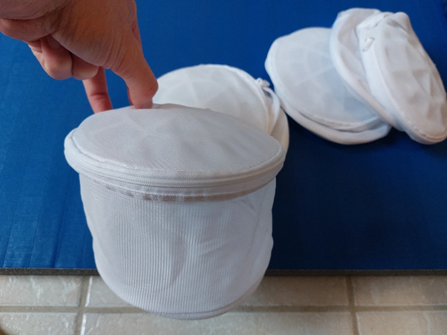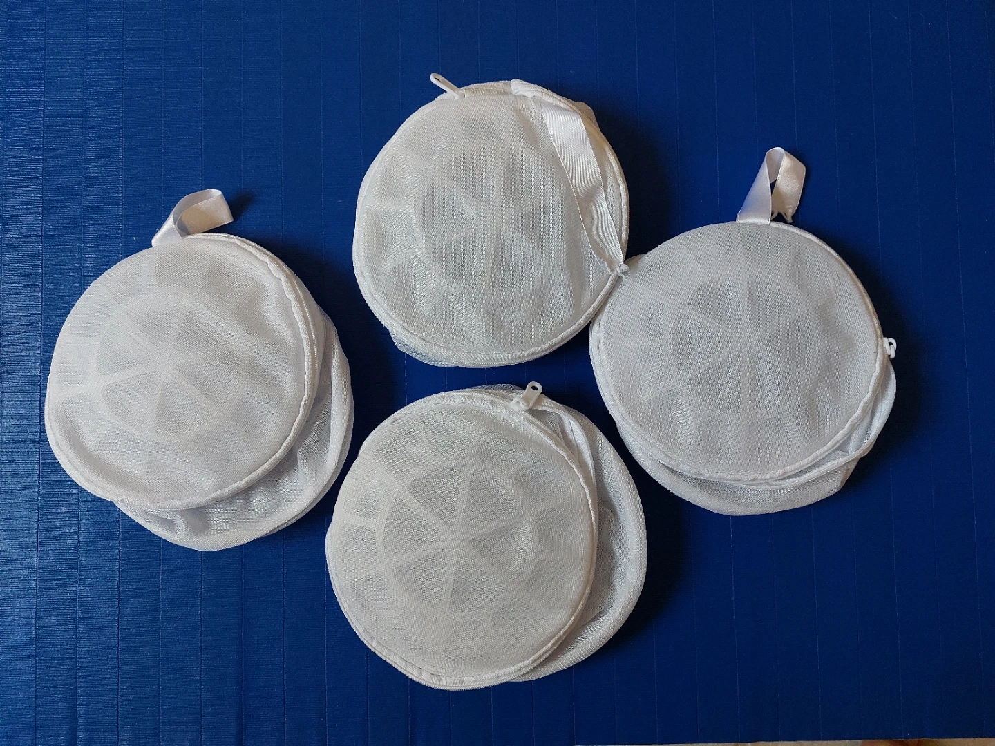 Four white mesh laundry bags for delicate items. They're made of fine mesh and a rigid top and bottom to keep clothes protected. Ideal for bras, socks, or other small garments in the wash.