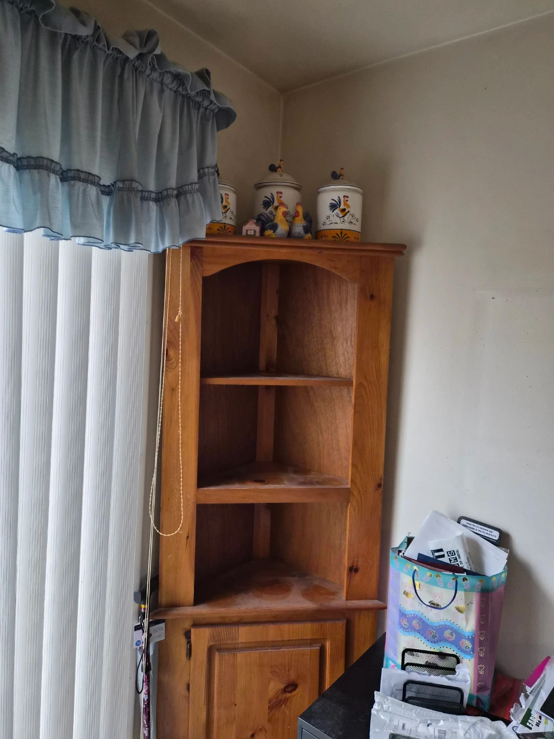 This wooden corner shelf unit offers open shelving and a cabinet below. Great for displaying decor or storing items! Cash only