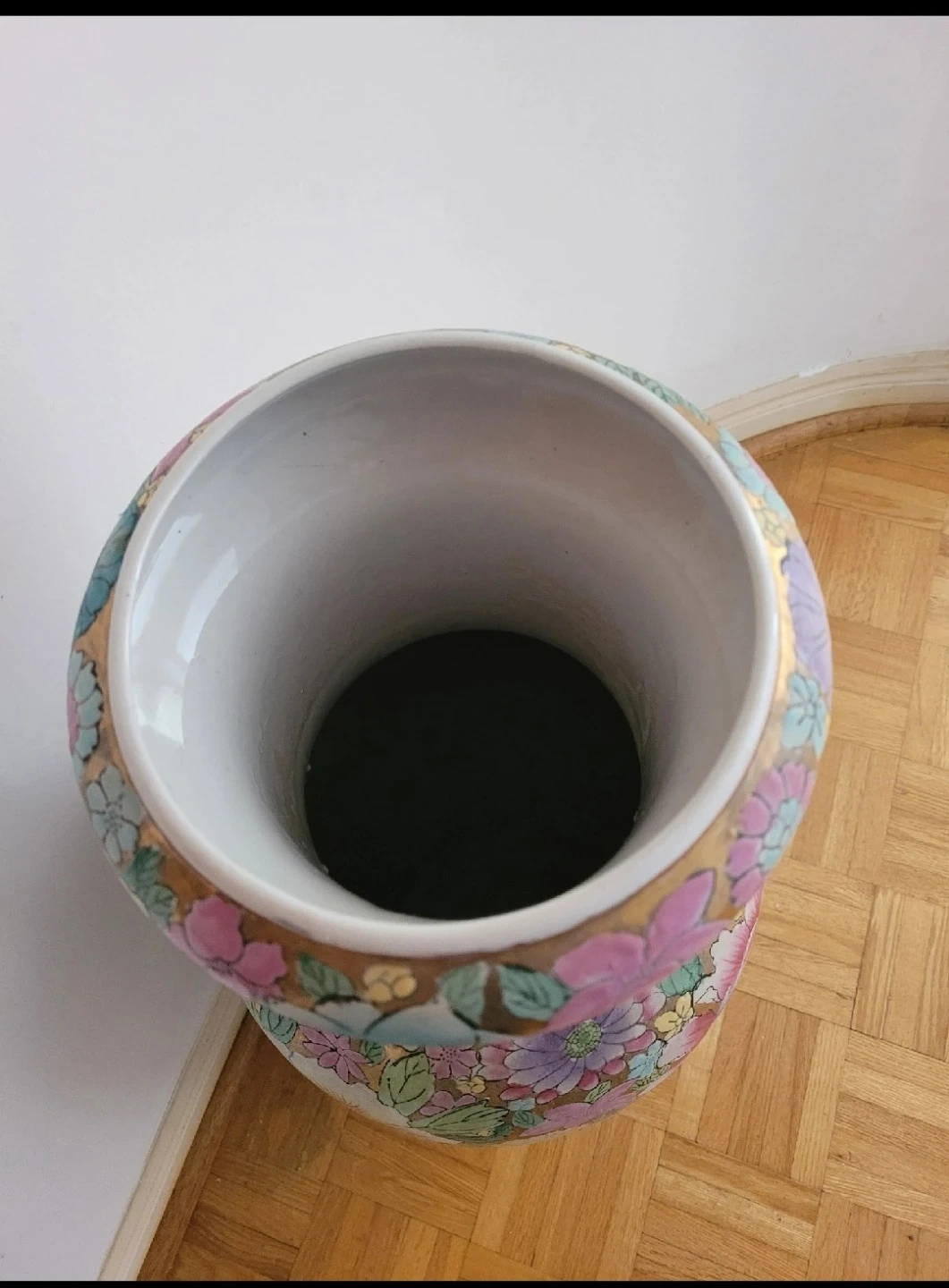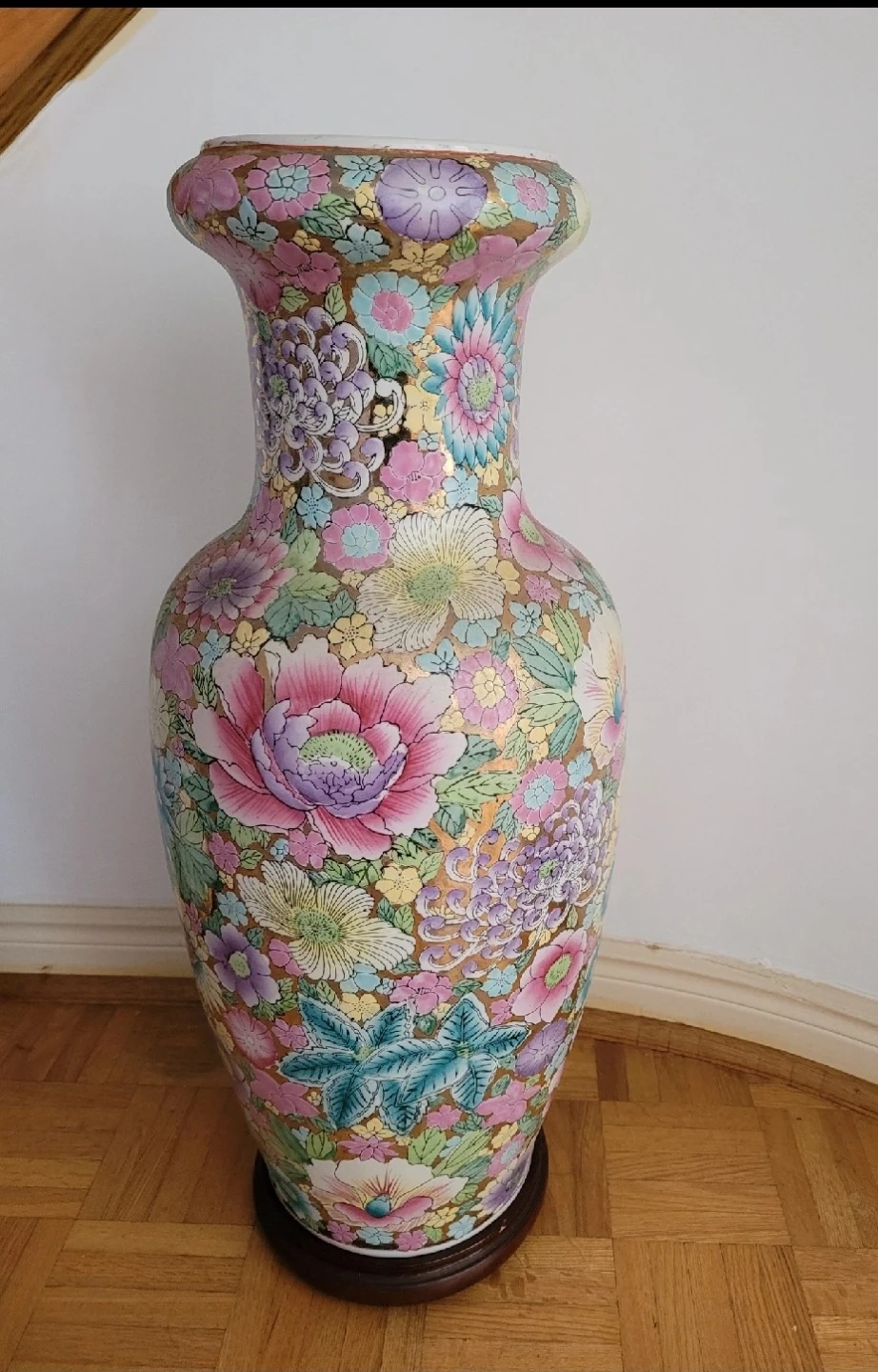 A beautiful large ceramic vase with a vibrant floral pattern. It features a gold-accented rim and a detailed design all over. This decorative piece stands on a wooden base, making it a lovely accent for any room.