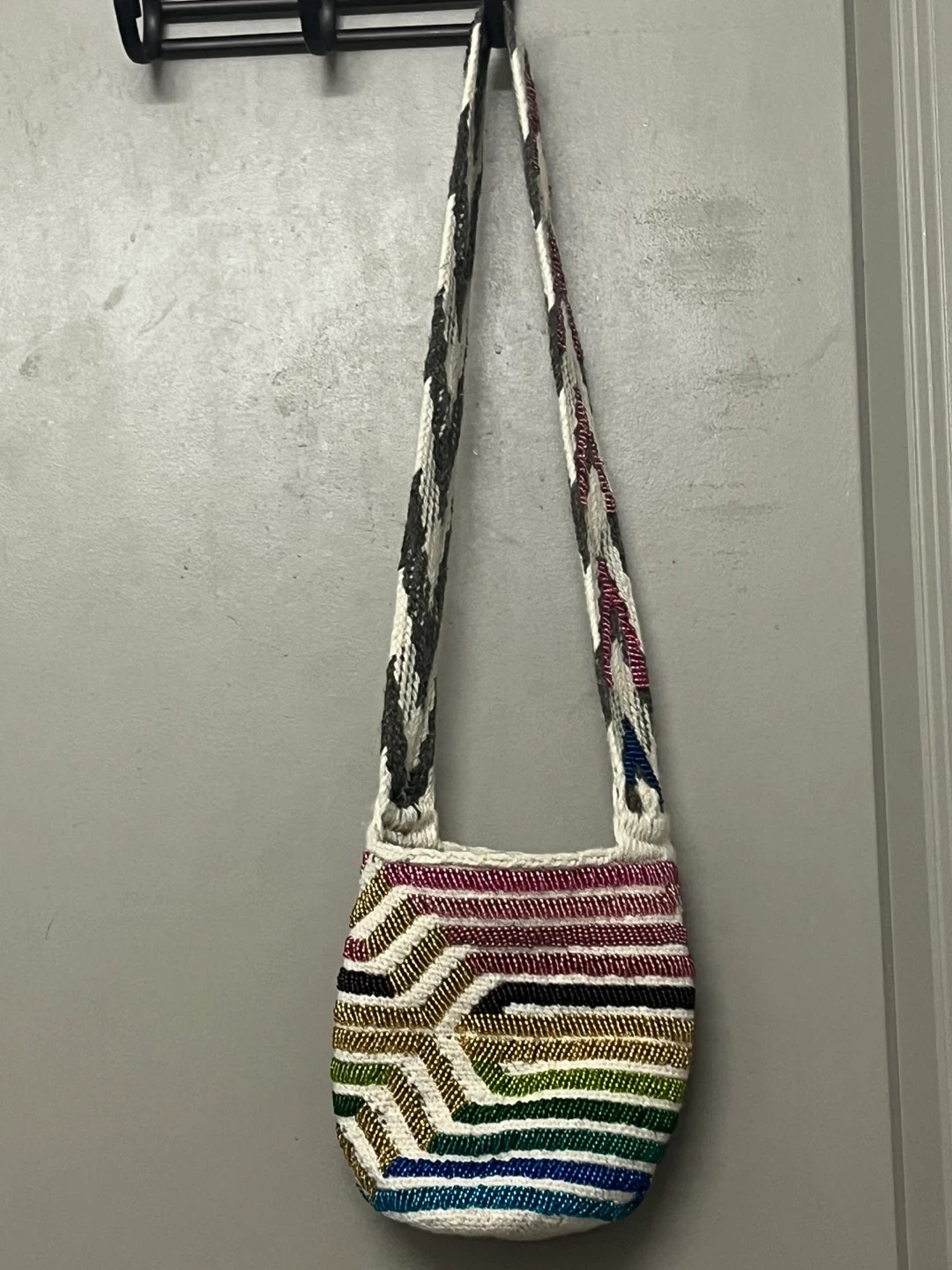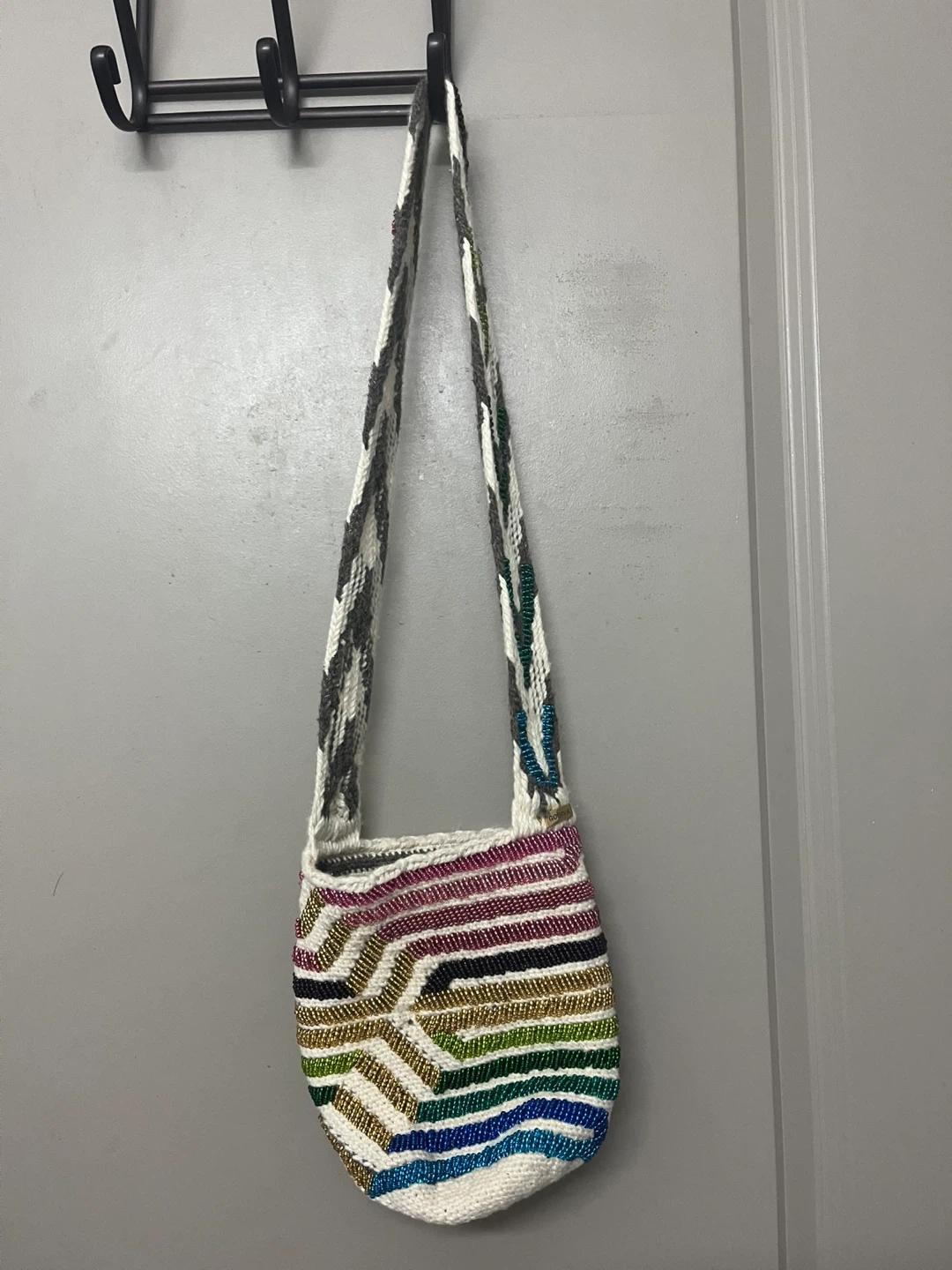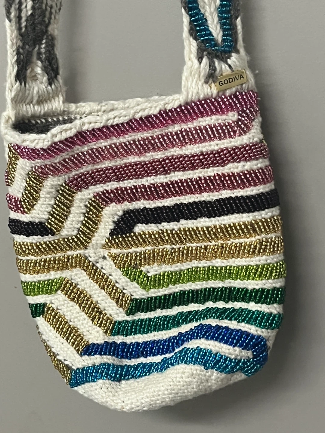 Godiva Beaded Wayuu Mochila Arhuaca Bag. Rainbow colors. Medium artisan original. Handwoven from 100% natural Colombian wool. Handbeaded by an indigenous woman in Colombia. A detailed beautiful work of art. Gently used. In excellent condition and shape. From a smoke/pet free and healthy home.