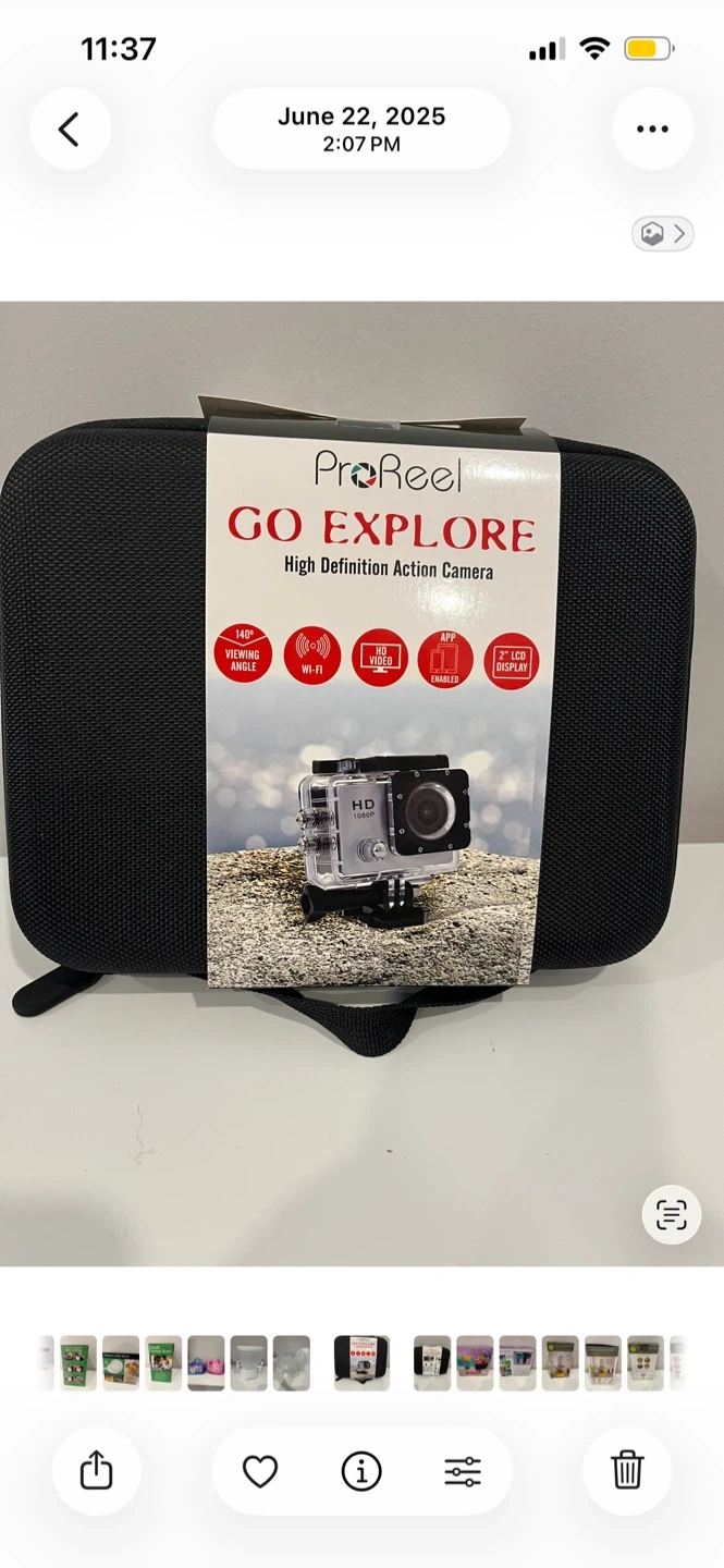 This ProReel GO EXPLORE is a high-definition action camera. It boasts a 140-degree viewing angle, Wi-Fi connectivity, HD video recording, app enablement, and a 2-inch LCD display. The camera records in 1080p resolution. It's suitable for capturing adventures and sports activities.