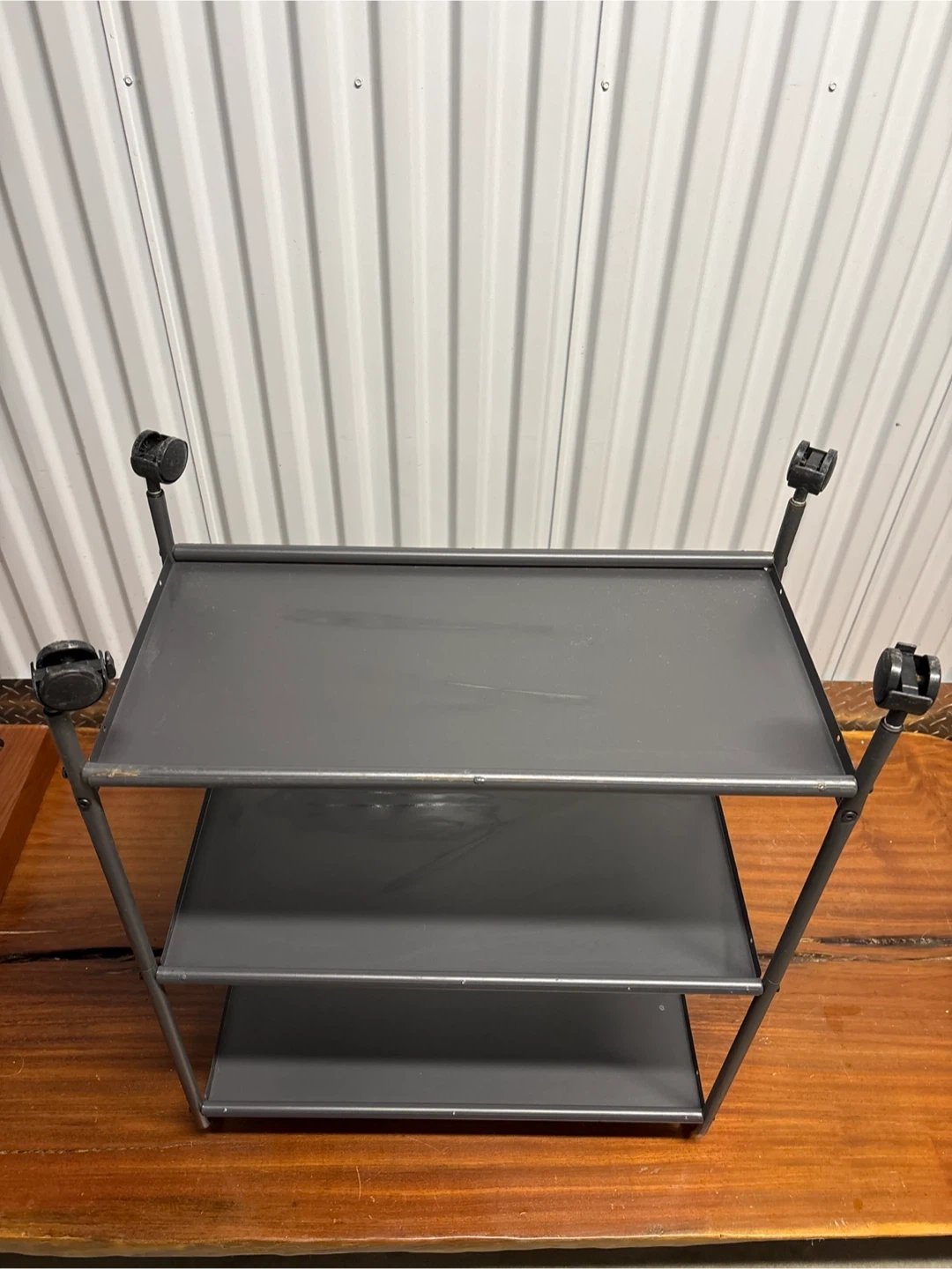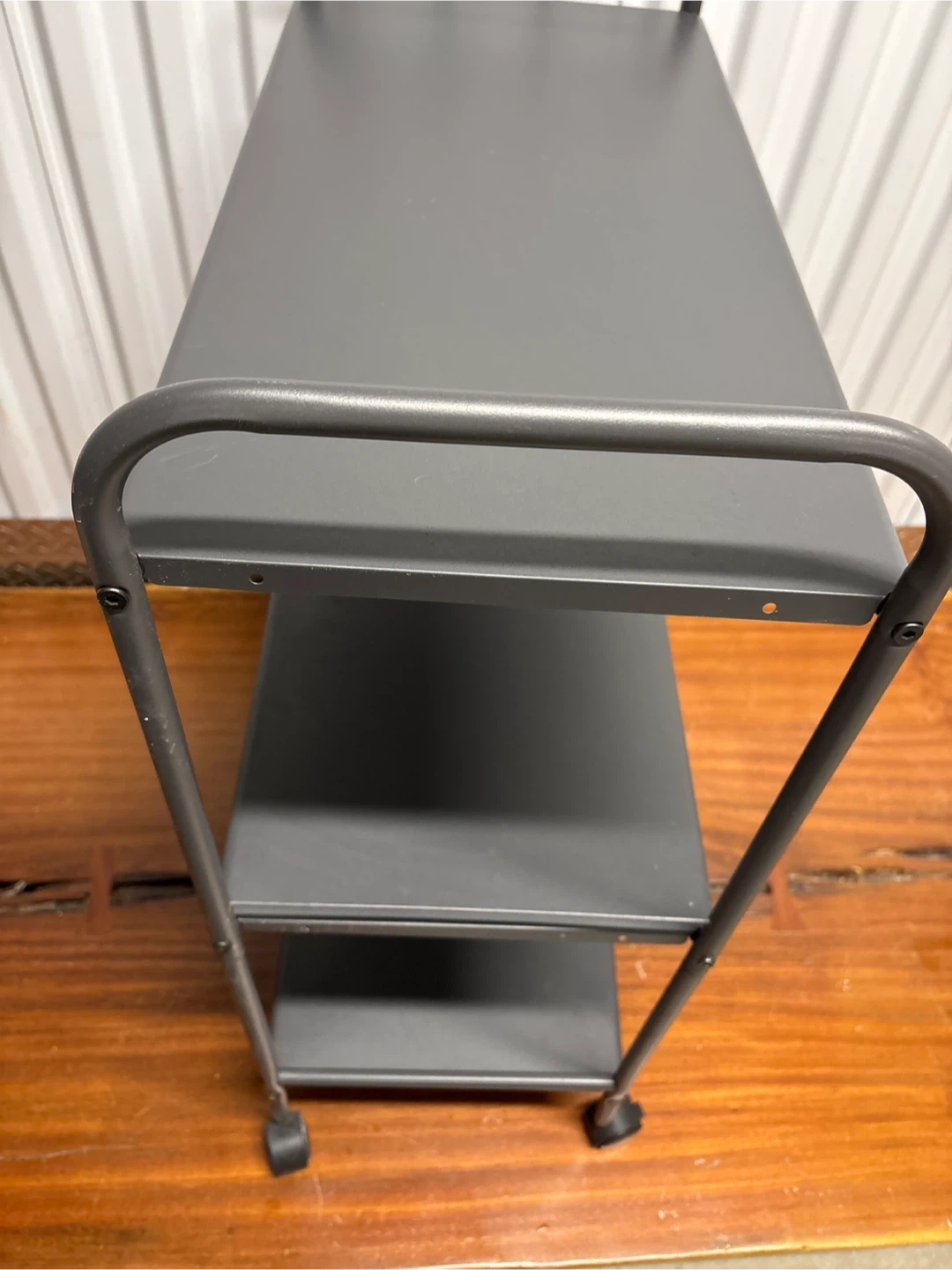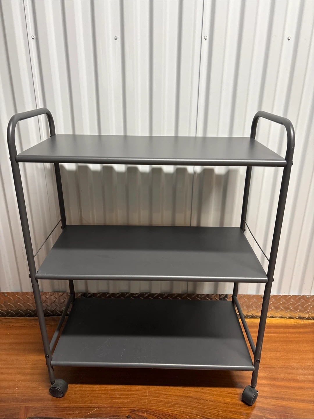 This is a gray metal rolling cart with three tiers. It's great for adding storage and organization to any room. The cart has wheels for easy mobility. It is in good condition and ready for a new home!