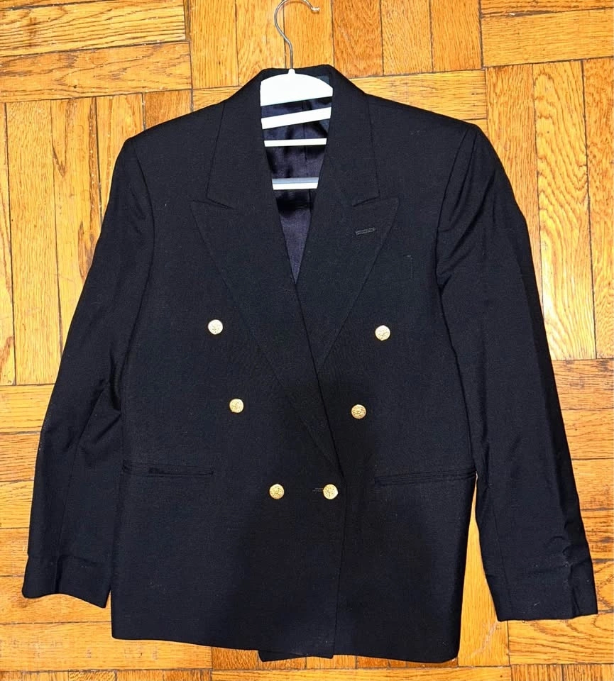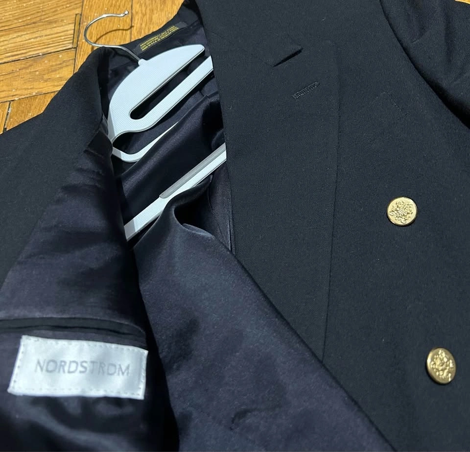 Nordstrom boys navy blue double-breasted blazer with gold buttons. Size 14 husky. In excellent gently loved condition. Measurements: 24” length from top of shoulder to bottom of hem; 15.5” across from under arm to under arm; 21” sleeve length from top of shoulder. Pick up on the Upper West Side of Manhattan.