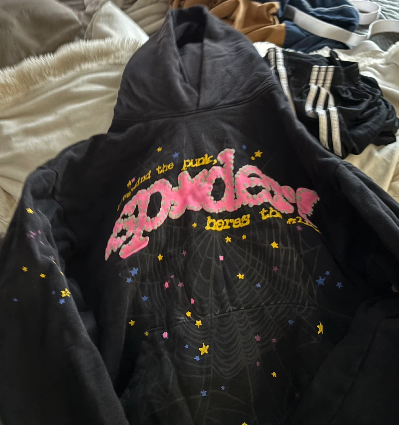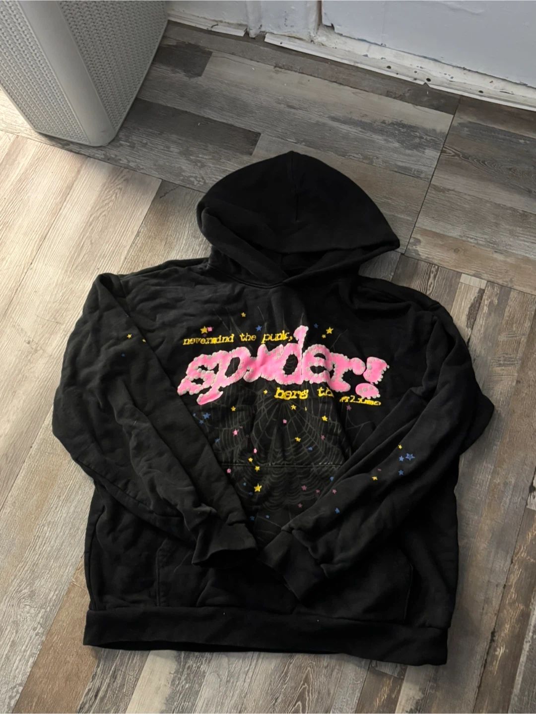 Black hoodie with pink glittery "spiders" graphic and celestial star accents. Features text that says "nevermind the punk, heres to hell.". Pullover style with front pocket and hood. It's a comfortable and eye-catching piece.