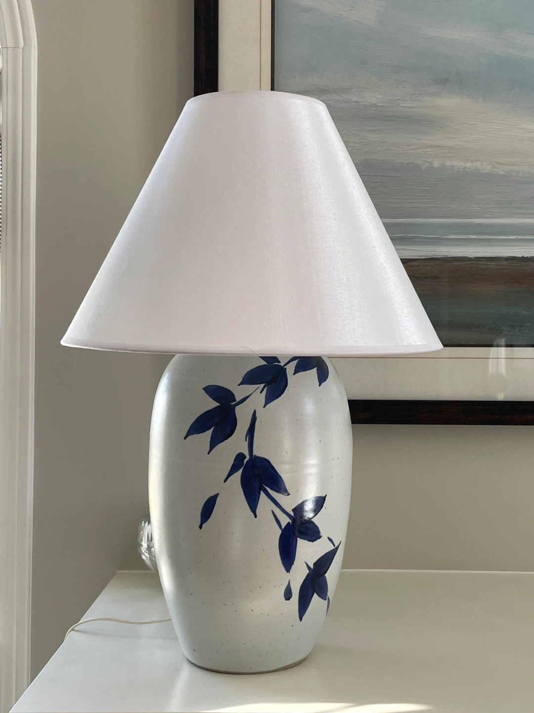 This vintage ceramic table lamp features a classic white base with a charming blue leaf pattern. It's topped with a white fabric shade, ready to add a touch of style to any room.