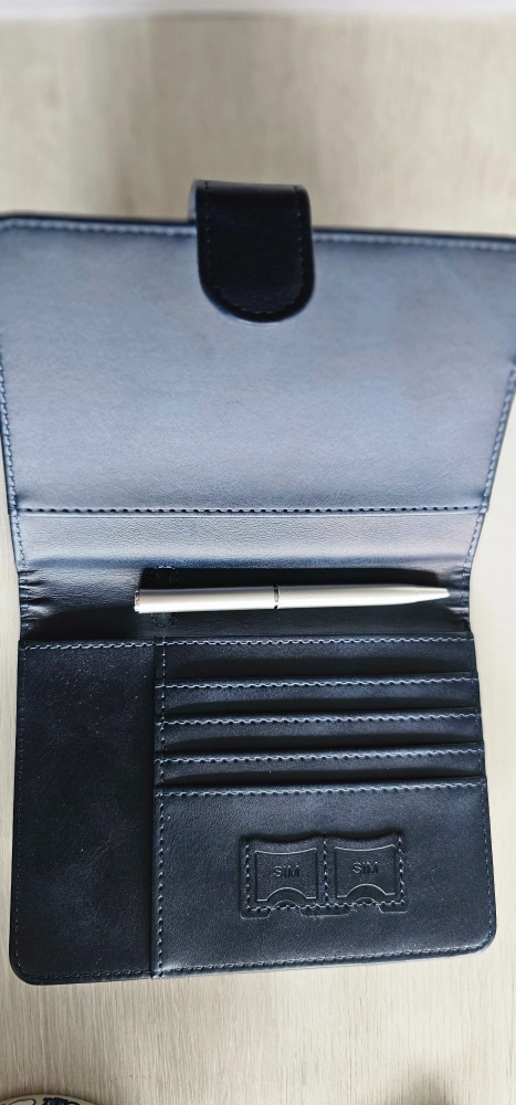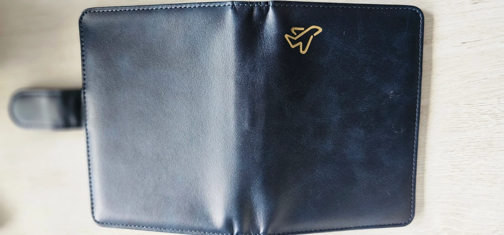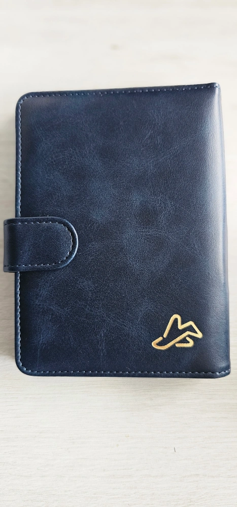 Selling a stylish blue leather travel wallet. It has a secure button closure and several slots for cards and documents. Perfect for keeping your essentials organized on the go!