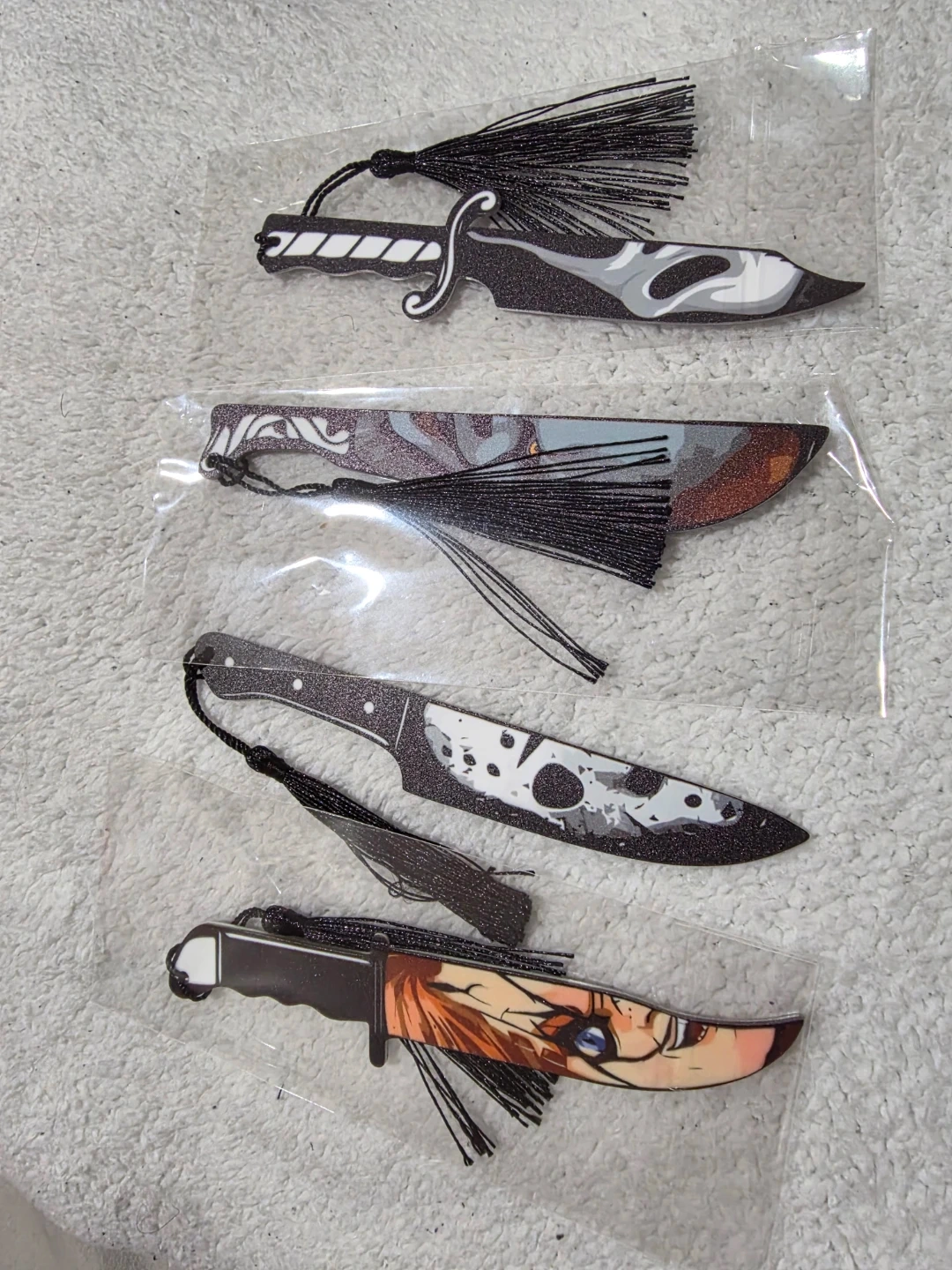 Four decorative bookmarks designed to look like anime-style knives. Each bookmark features a unique design and includes a black tassel. They're perfect for adding a touch of flair to your reading material.
