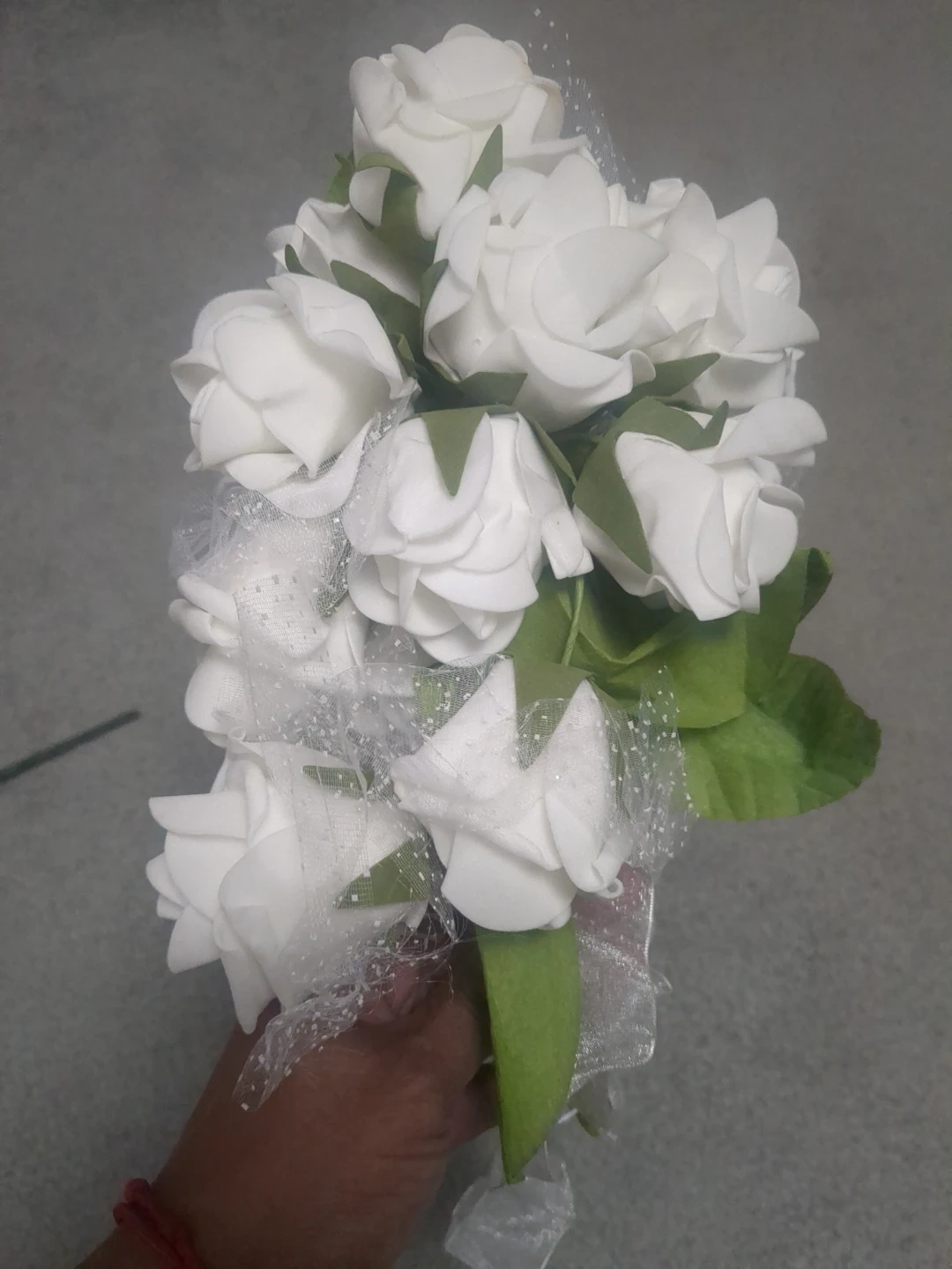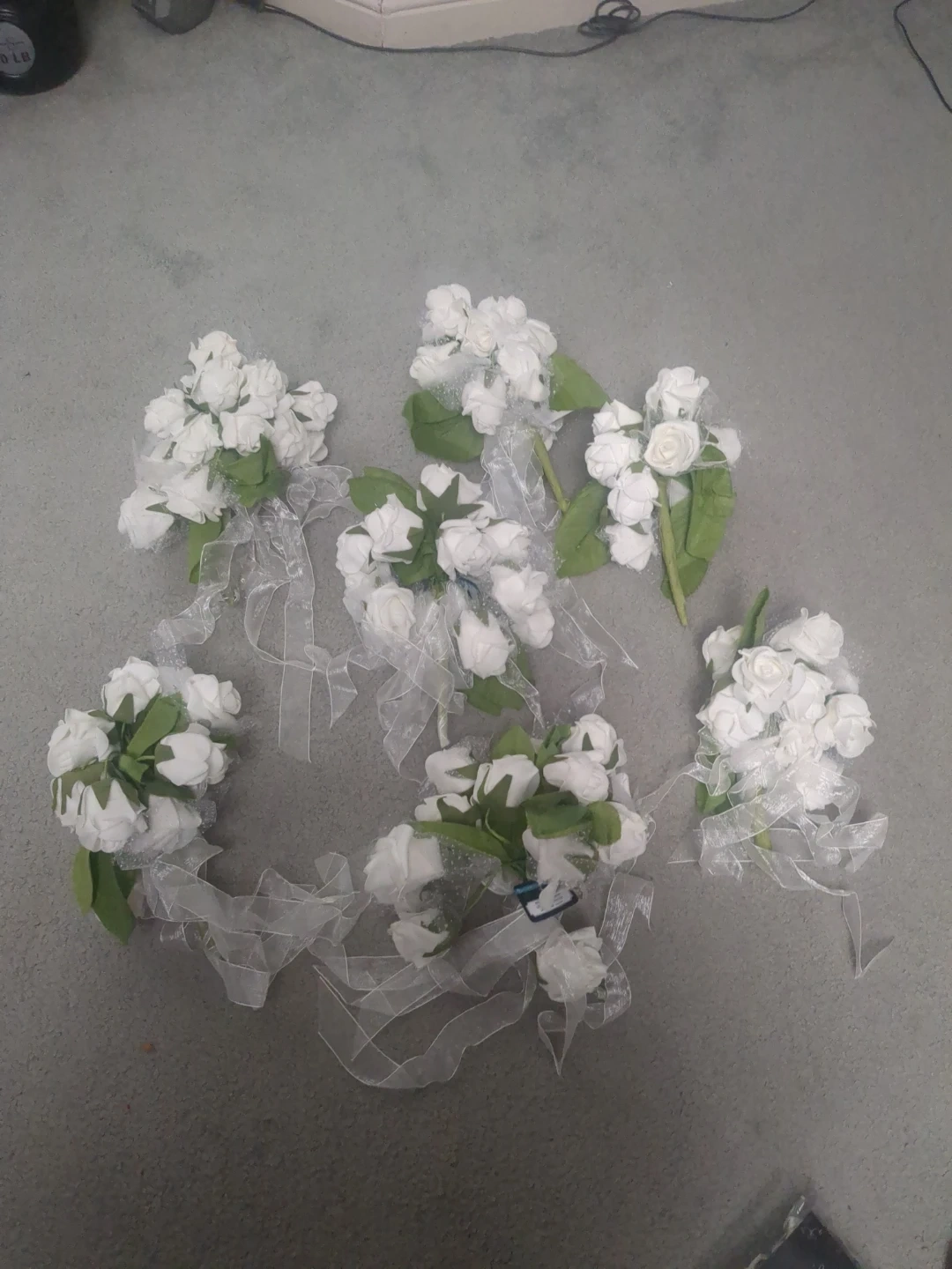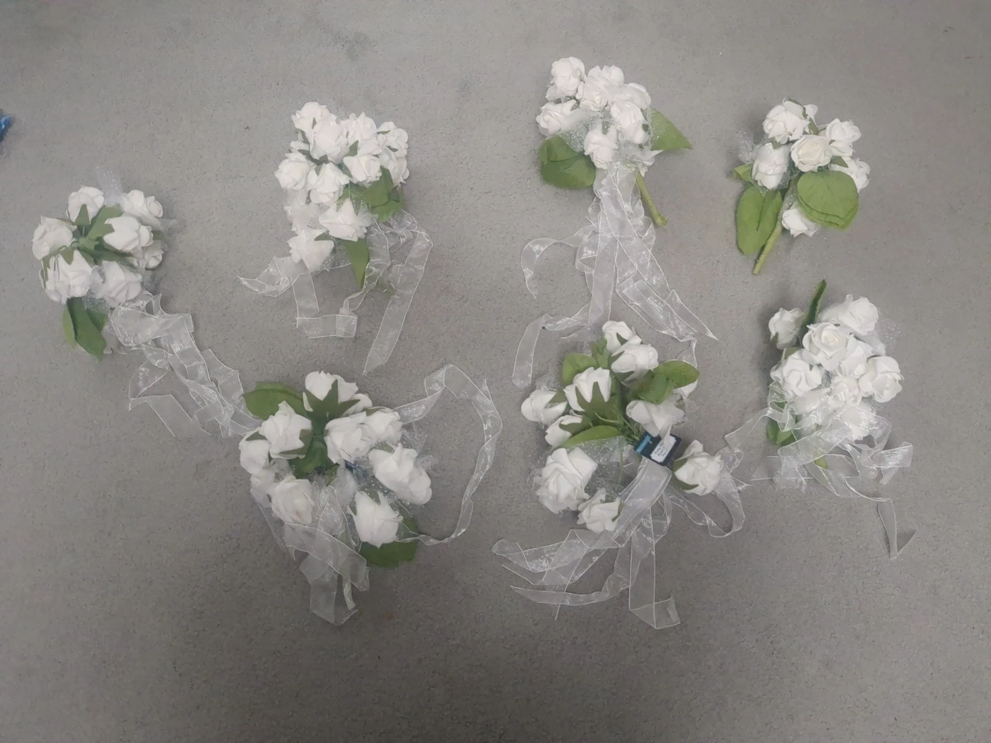 This set includes six small artificial white rose bouquets, each adorned with green leaves and decorative white ribbon. They appear to be designed for events like weddings or formal occasions. They're great for DIY floral arrangements or event decorations.